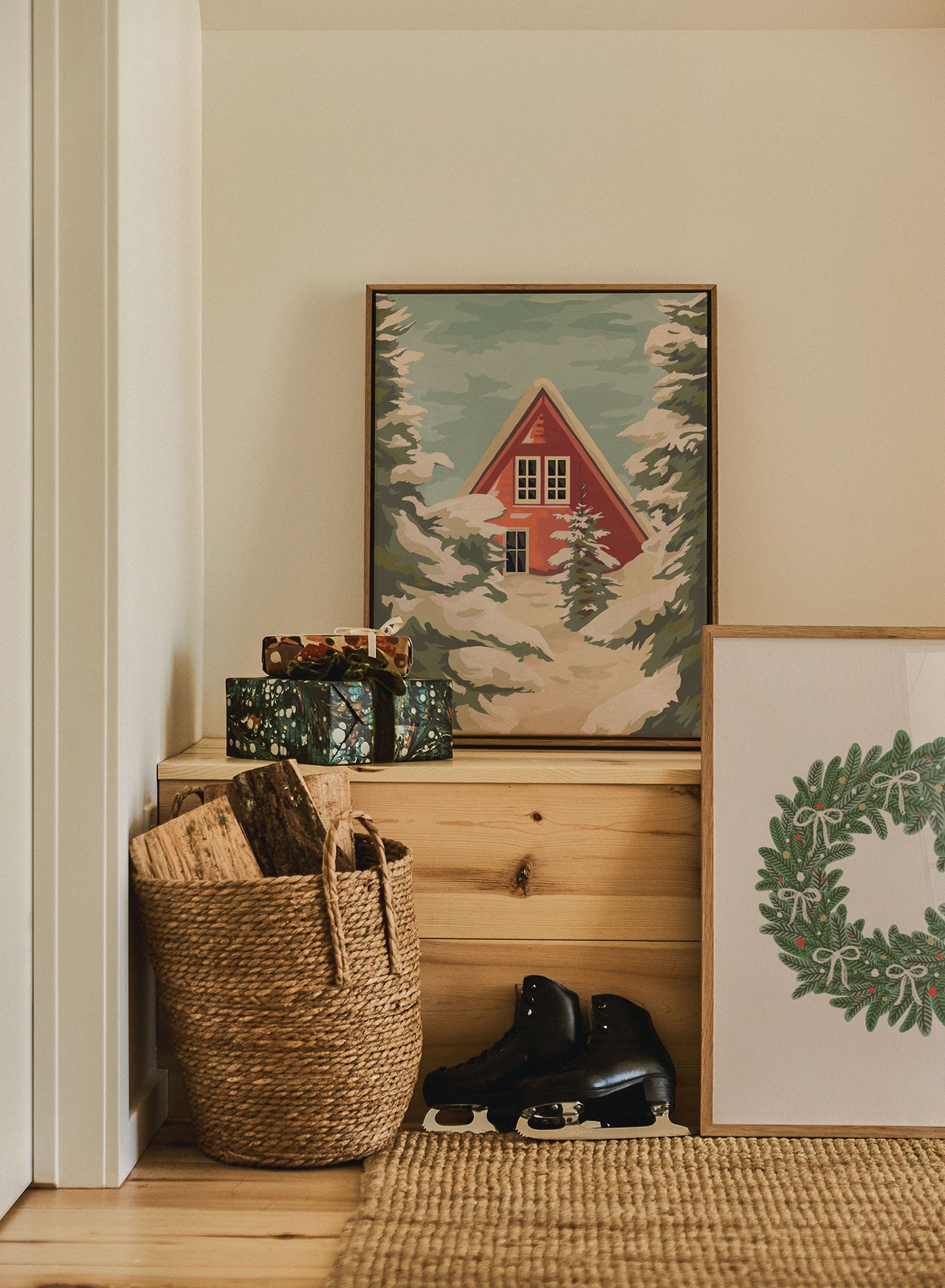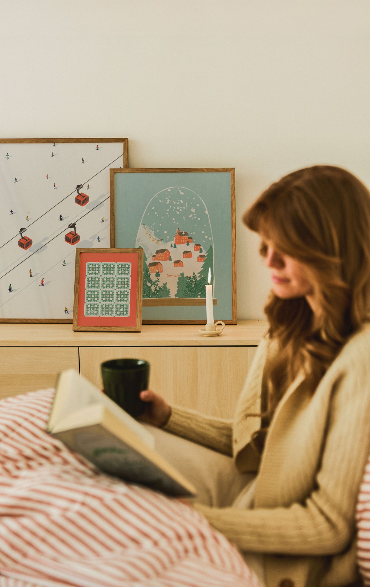 Every home needs a spot to pause — somewhere you can actually finish your cocoa before it gets cold. A cozy reading chair and a piece of art that sets the tone are all you need to create the perfect place to read a book as winter sets in. Hang our Vintage Holiday Bow Print from O’Tannenbaum. It’s playful but grounded, especially paired with a tartan cushion.