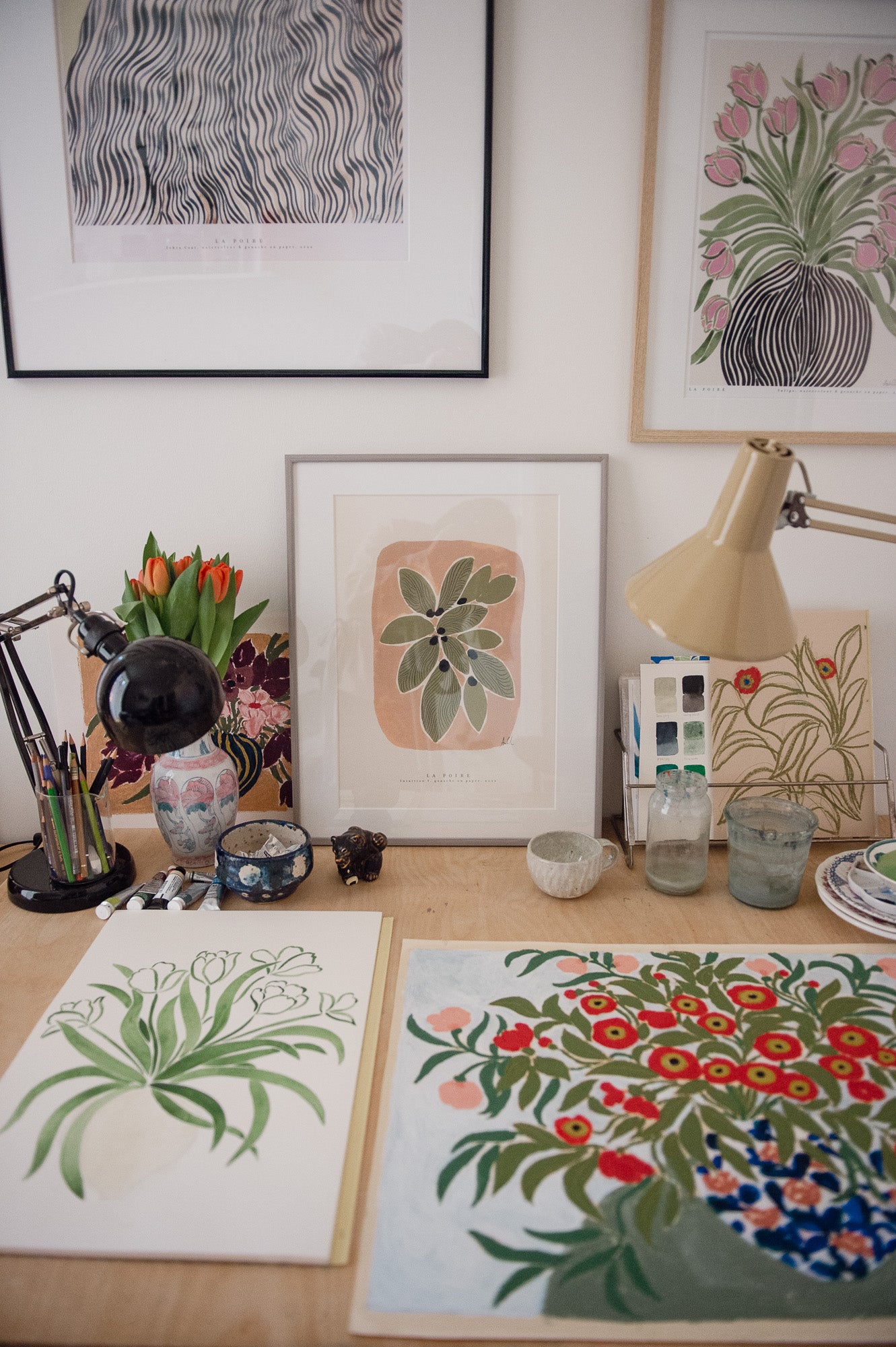 Je peins souvent à partir de fleurs vivantes, mais je trouve également mon inspiration dans des livres d'art et de botanique trouvés dans des friperies. J'ai toujours été inspirée par Matisse, depuis que j'ai vu ses œuvres pour la première fois lorsque j'étais enfant et que j'ai été complètement émerveillée.