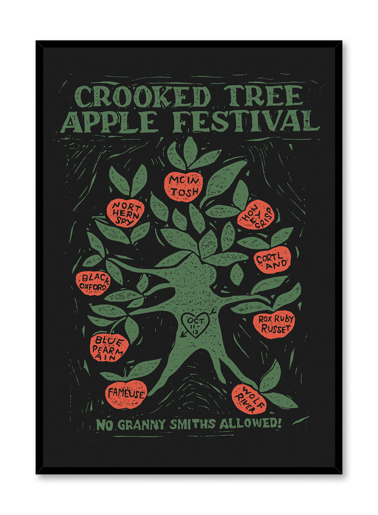 Ce affiche représente un arbre stylisé avec une touche ludique, mettant en valeur différentes variétés de pommes comme la McIntosh, la Cortland et la Black Oxford. Chaque pomme est illustrée de manière vivante, suspendue aux branches de l'arbre, avec son nom inscrit en caractères gras et originaux. Le fond sombre contraste fortement avec les rouges et les verts vibrants, créant un impact visuel saisissant. La phrase « Crooked Tree Apple Festival » couronne la scène, ajoutant une touche d'humour avec la mention « Interdit aux Granny Smith ! » en bas.