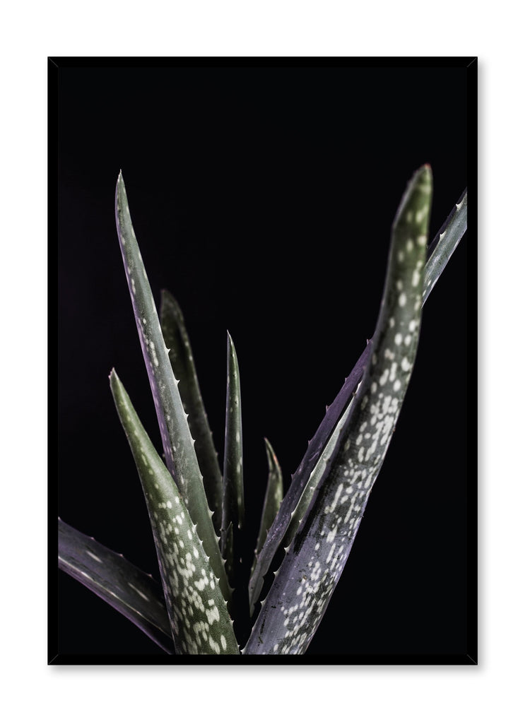 Sur cette séduisante photographie, les tiges architectoniques de la plante d'aloès captent la lumière naturelle devant un fonds noir.