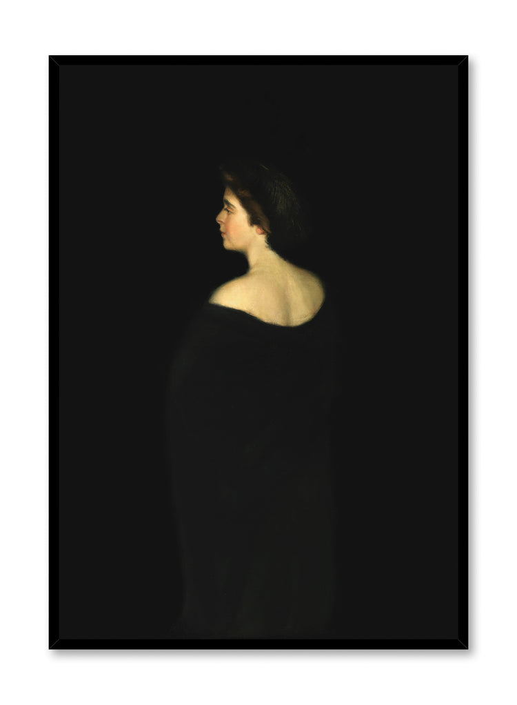 Cette peinture de portrait capture la silhouette d'une femme vêtue de noir, de dos face au spectateur. Elle est positionnée contre un fond sombre et austère, qui se fond avec ses vêtements, faisant ressortir sa peau pâle. Sa tête est légèrement tournée, permettant un aperçu de son profil, bien que son visage reste principalement dans l'ombre.