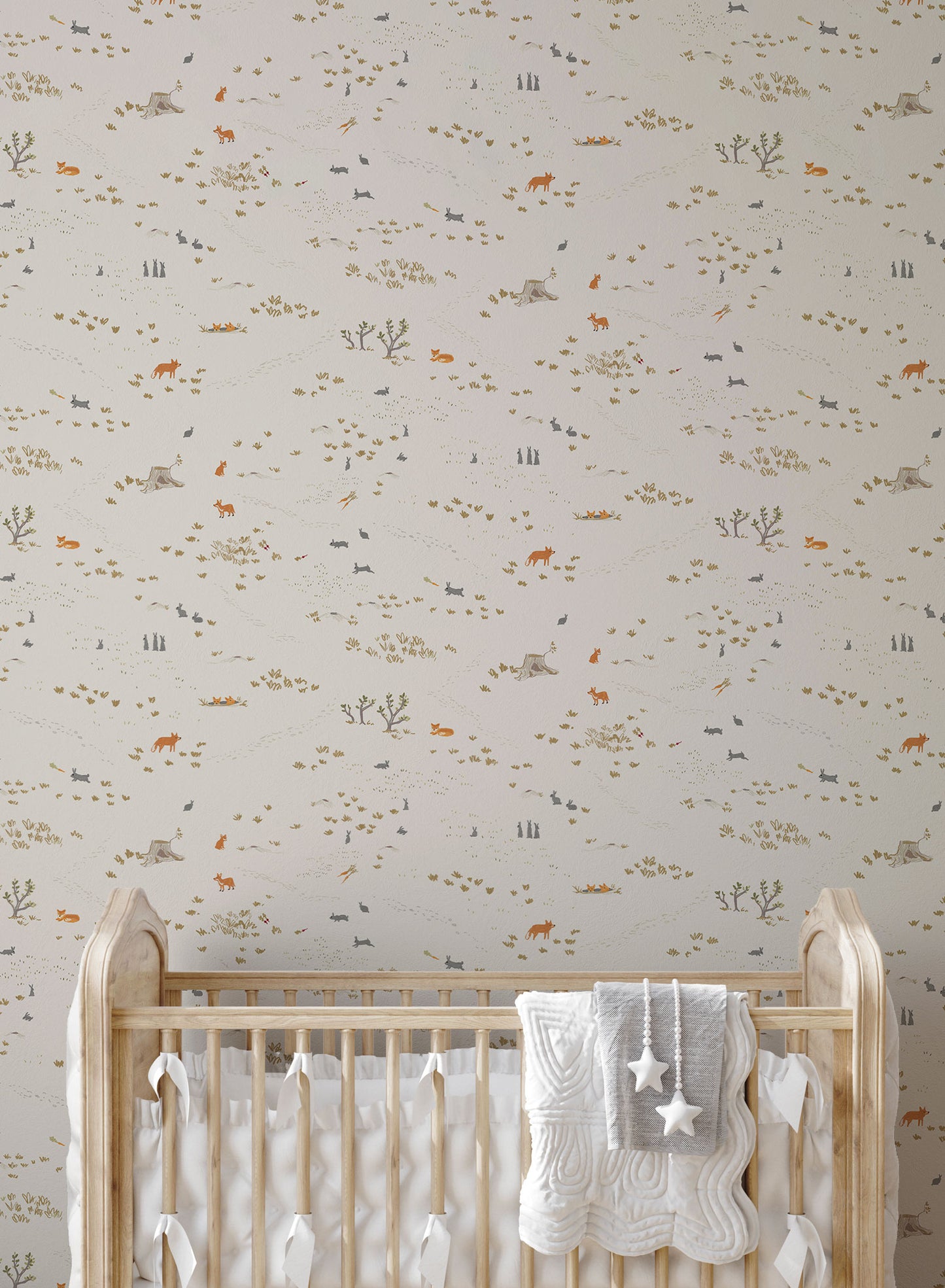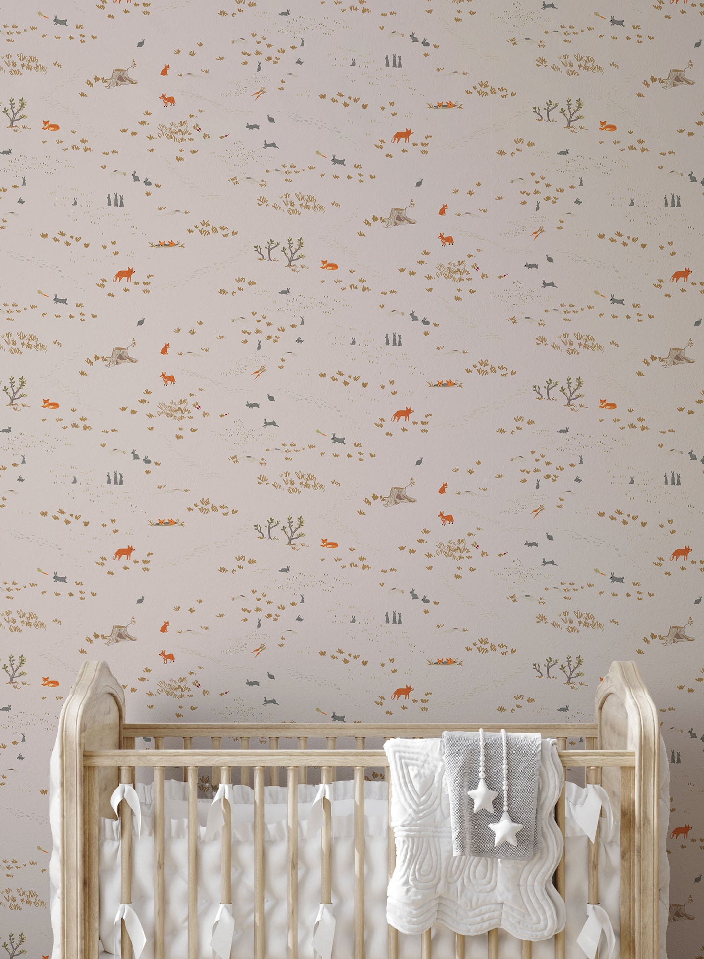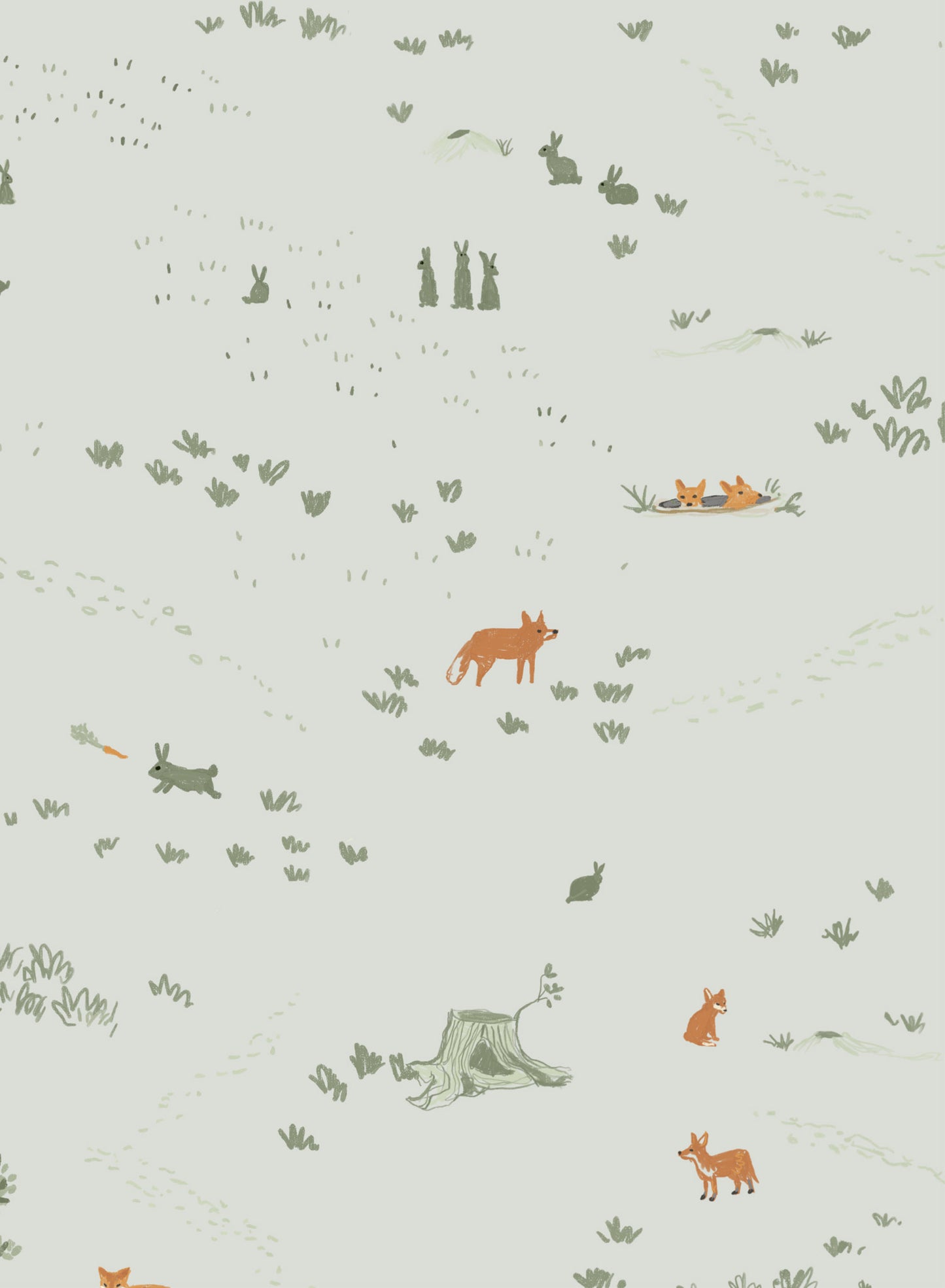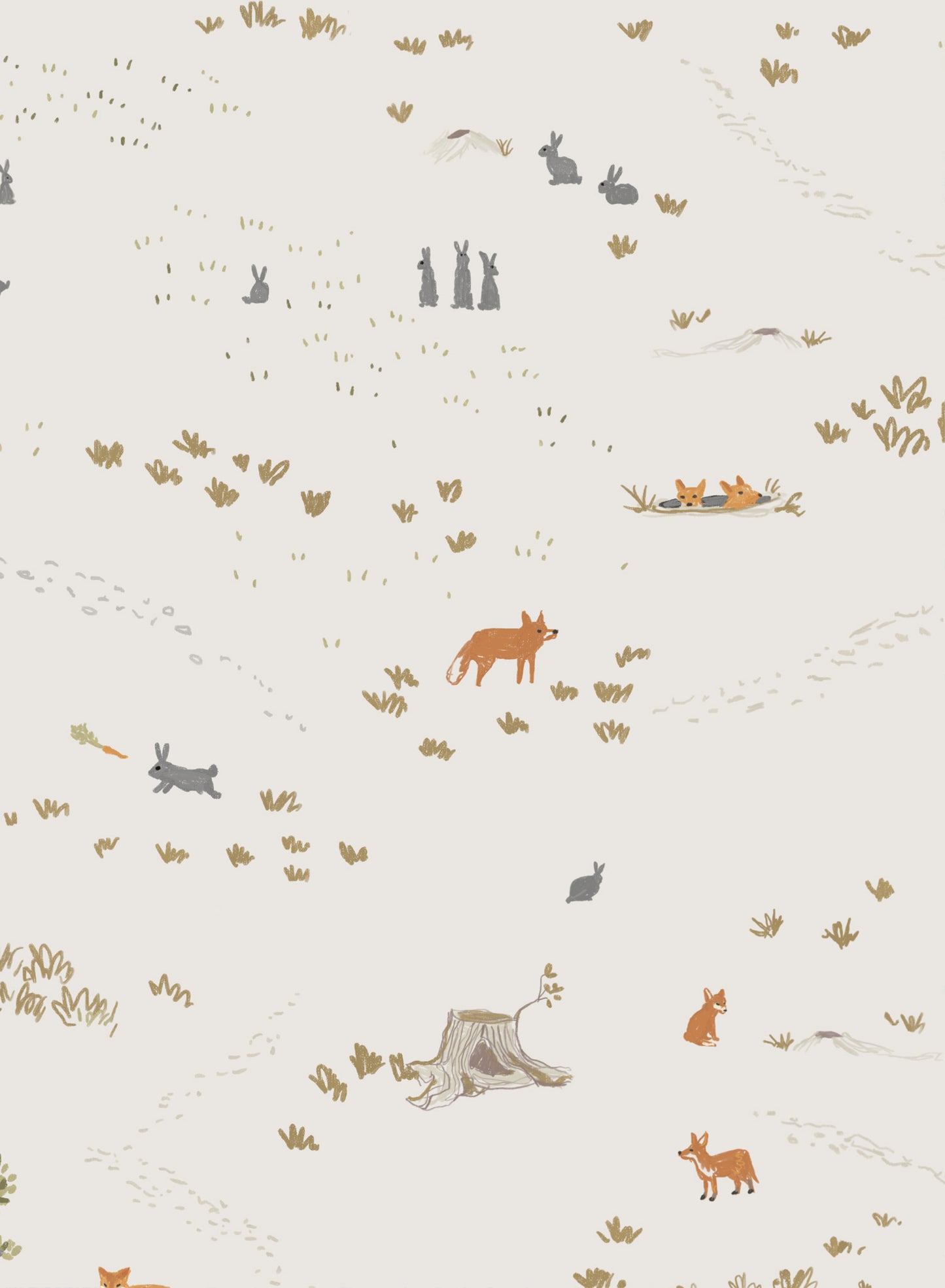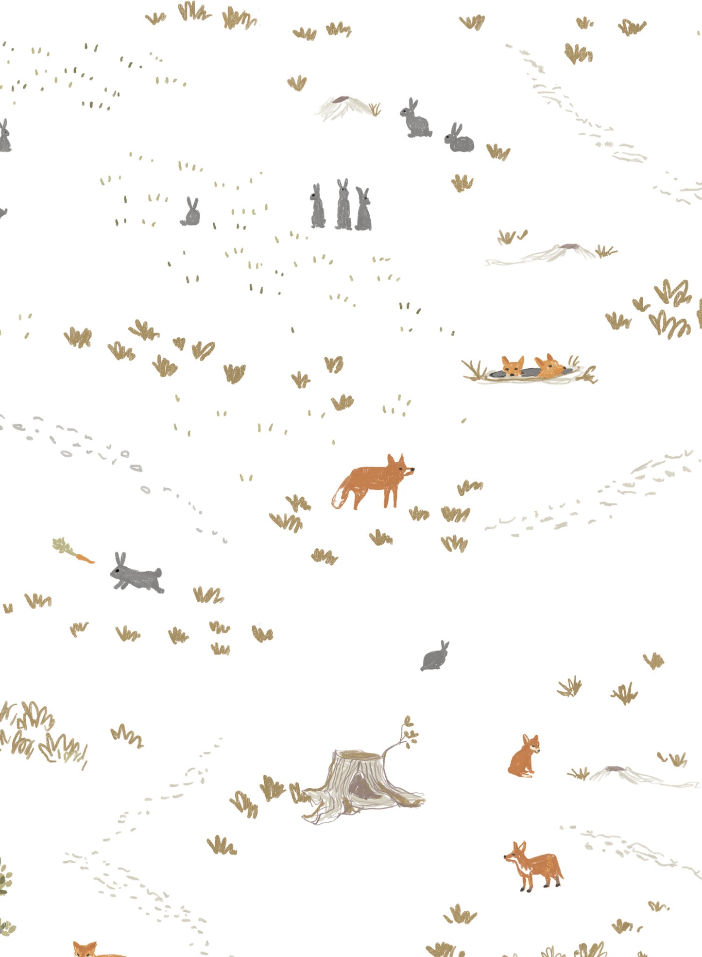 Gardez la chaleur de l'automne toute l'année avec "Automne rusé", un motif de papier peint pour enfants représentant des troncs d'arbres, des renards, des lapins et de jolies feuilles.