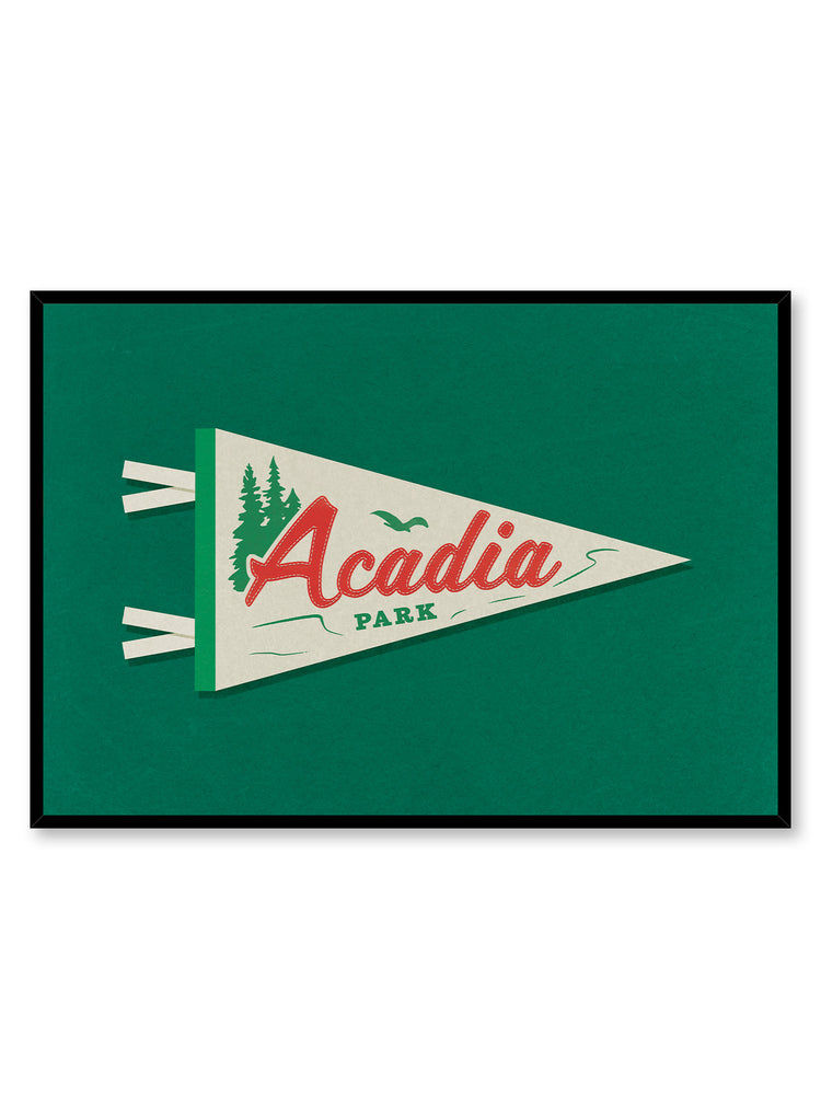 Cette affiche d'art vibrante représente un fanion pour le parc Acadia, avec des tons verts et rouges luxuriants. Le design rétro et les couleurs vives célèbrent la beauté de ce parc emblématique, ce qui en fait un bel ajout à n'importe quel espace.