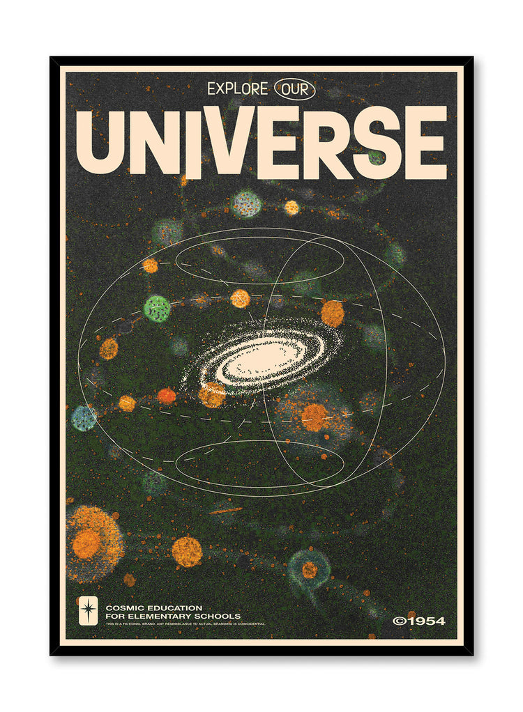 Cette affiche d'art d'inspiration vintage présente une carte détaillée de l'univers, avec divers corps célestes et galaxies représentés dans des tons riches et sombres. Son design classique est parfait pour ceux qui apprécient la beauté du cosmos.