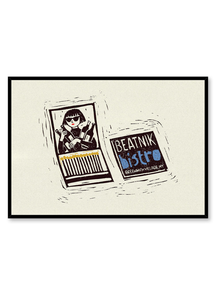 Cette linogravure affiche présente un diptyque composé d'une boîte et d'une pochette d'allumettes, célébrant un « Bistro Beatnik » fictif de Greenwich Village, à New York. Une femme élégante, portant des lunettes de soleil audacieuses et une coupe au carré chic, est illustrée à l'intérieur de la pochette, tenant deux bouteilles. La boîte d'allumettes qui l'accompagne présente une typographie rétro et ludique, évoquant l'énergie créative de la Beat Generation.