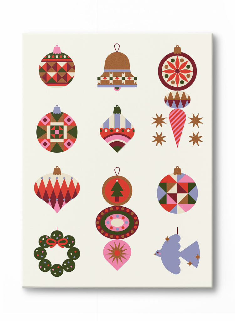 Cette version du collage d'ornements offre une version plus légère du thème des vacances, avec un fond crème doux qui permet aux couleurs des ornements de ressortir. Chaque ornement présente un motif géométrique différent, avec des rouges, des verts, des roses et des bleus vifs qui créent un ensemble de couleurs harmonieux. Les ornements sont disposés dans une grille propre et équilibrée.