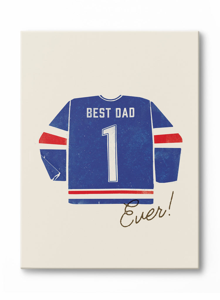 Cette toile nostalgique présente un maillot de hockey bleu classique orné de la phrase à la fois ludique et touchante « Meilleur papa du monde ! » Des contrastes saisissants et un effet vieilli de style vintage créent une esthétique à la fois énergique et délicieusement rétro.