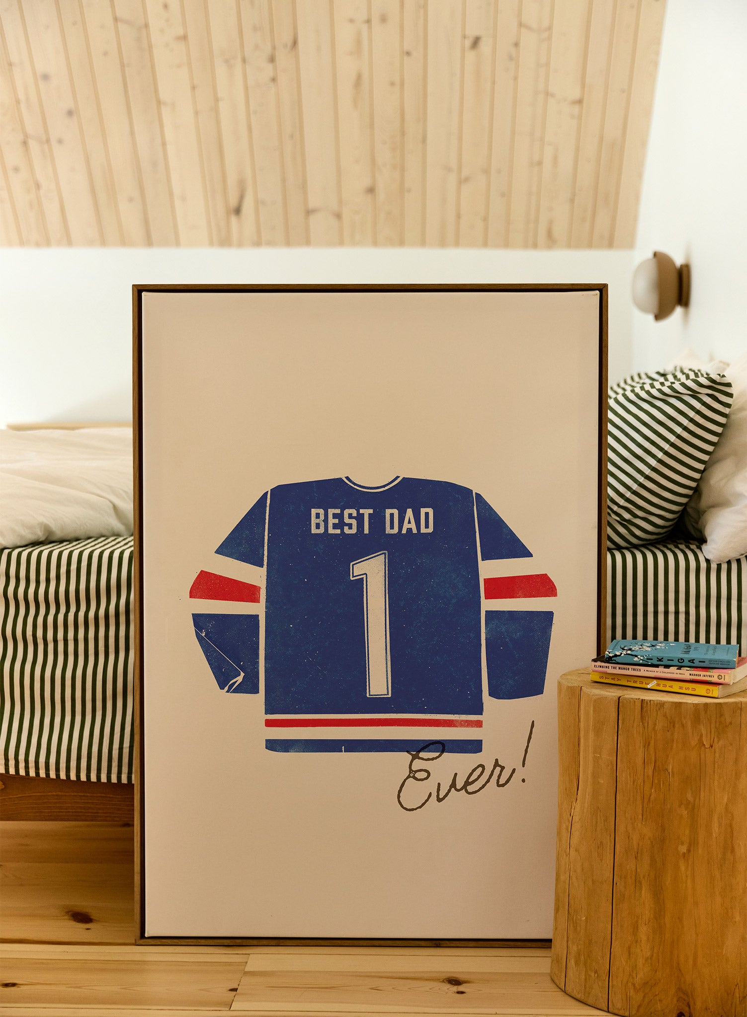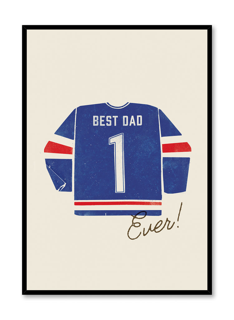 Ce affiche nostalgique présente un maillot de hockey bleu classique orné de la phrase à la fois ludique et touchante « Meilleur papa du monde ! » Des contrastes saisissants et un effet vieilli vintage créent une esthétique à la fois énergique et délicieusement rétro.