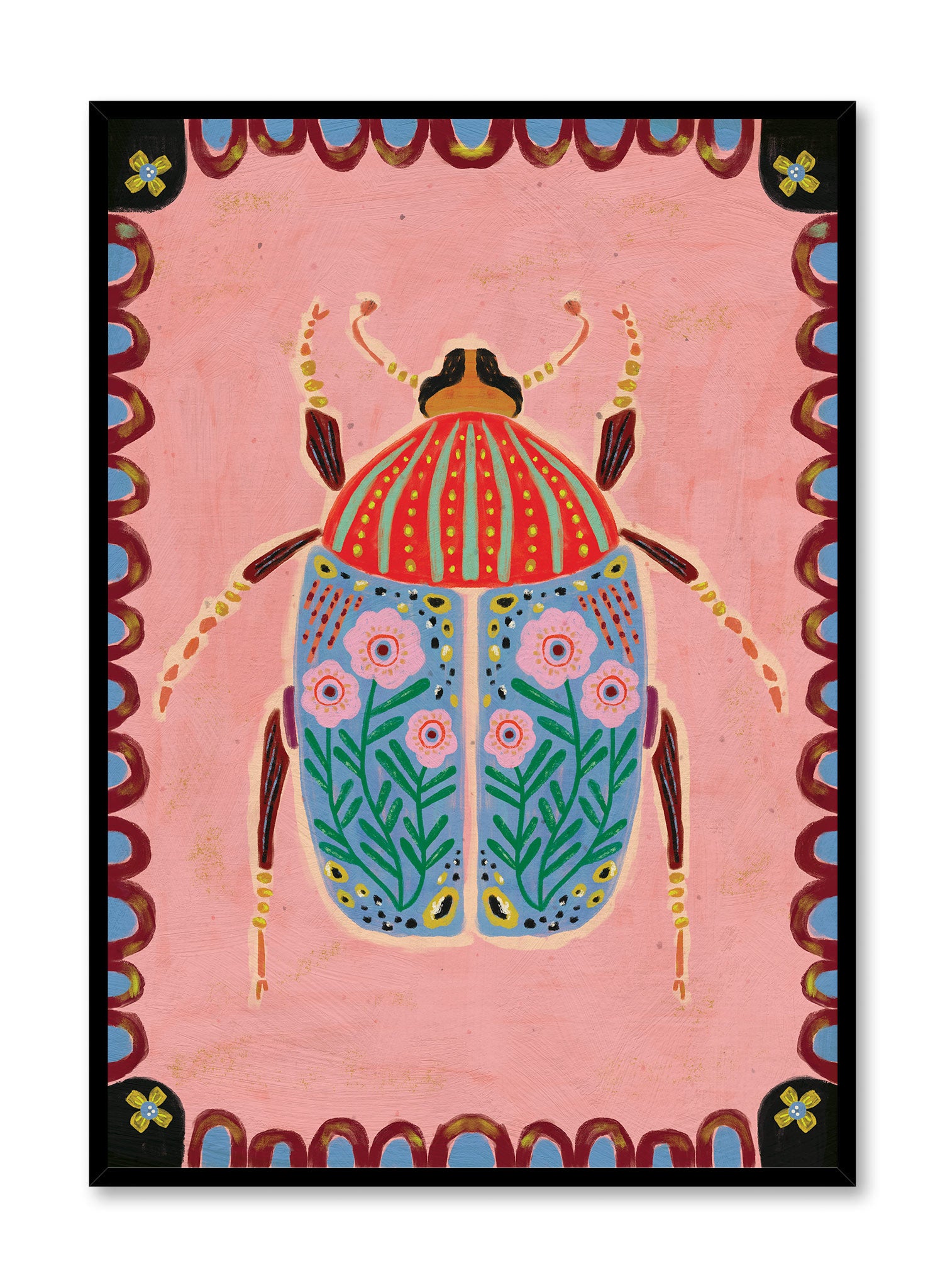 Un coléoptère botanique doté de personnalité, cette pièce de Kenzie Elston associe l'anatomie des insectes à une dose de gaieté fleurie. Ses ailes sont parsemées de délicates fleurs roses, sur fond de bleu cobalt et de jaune doré, tandis qu'un thorax rouge et jaune donne de l'éclat.