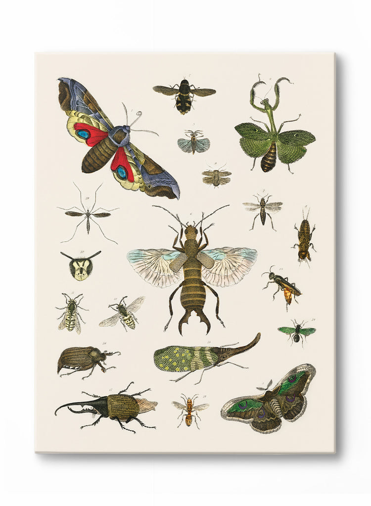 Œuvre sur toile scientifique vintage présentant une variété d'insectes aux couleurs naturelles (vert, brun, noir et rouge) sur un fond crème. Cette œuvre sur toile est parfaite pour ajouter une touche de nature et d'histoire à n'importe quel espace.
