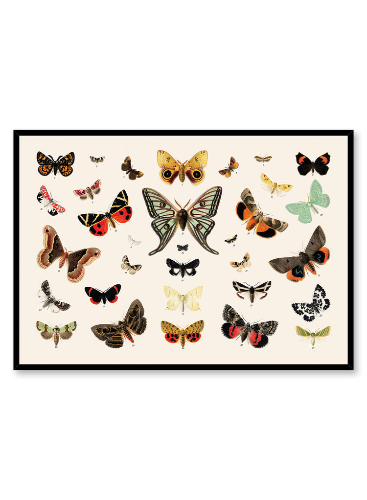 Une affiche détaillée présentant une collection de papillons aux couleurs et motifs variés (orange, jaune, rouge, vert et noir) sur un fond crème. Cette illustration scientifique est à la fois belle et éducative.