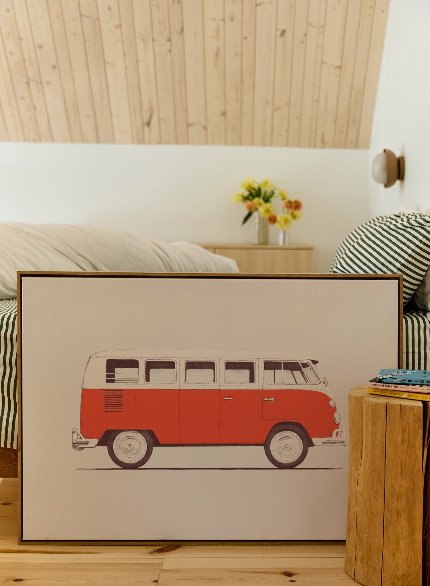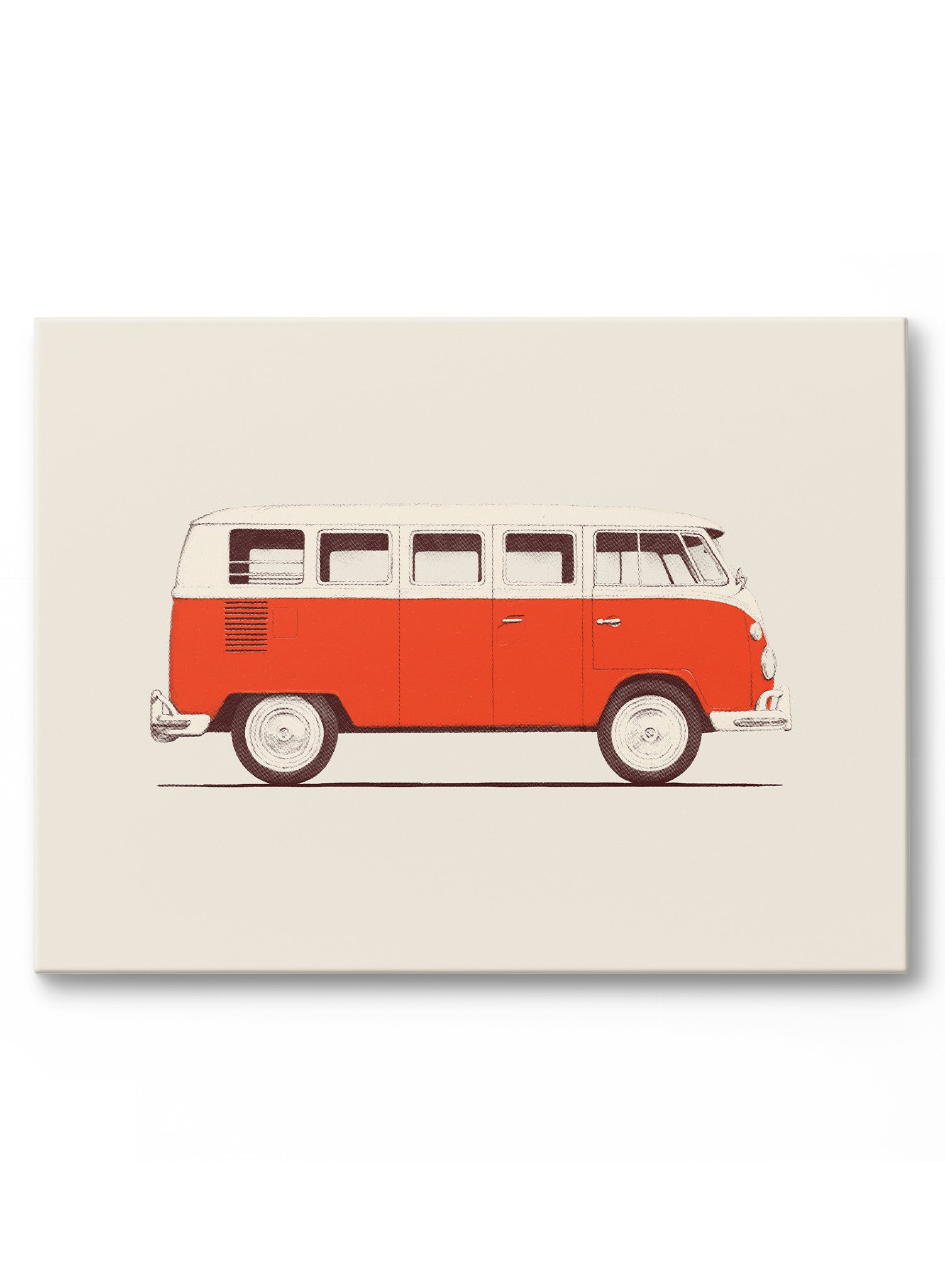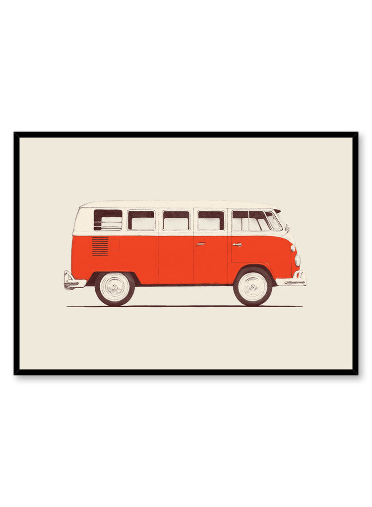 Représentant un camping-van vintage aux lignes épurées dans des tons rouge vif et crème, ce affiche évoque immédiatement les road trips tranquilles et le charme rétro. Des détails simples et une composition graphique épurée confèrent à ce affiche une clarté visuelle élégante.