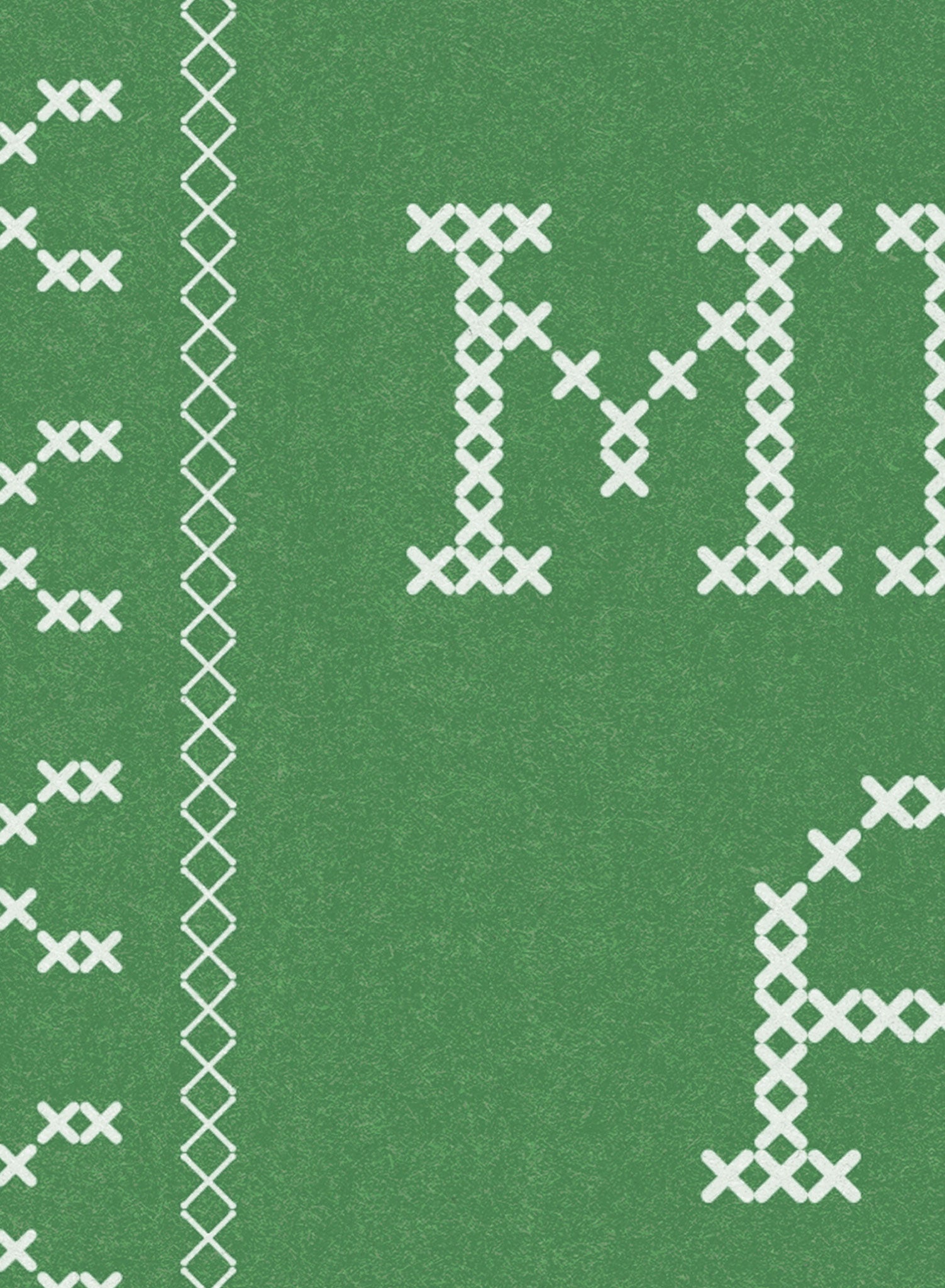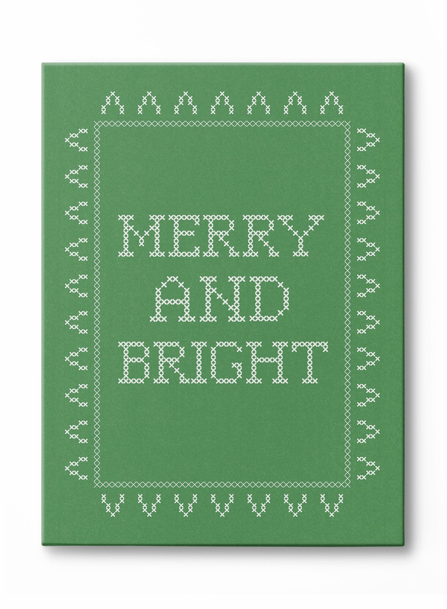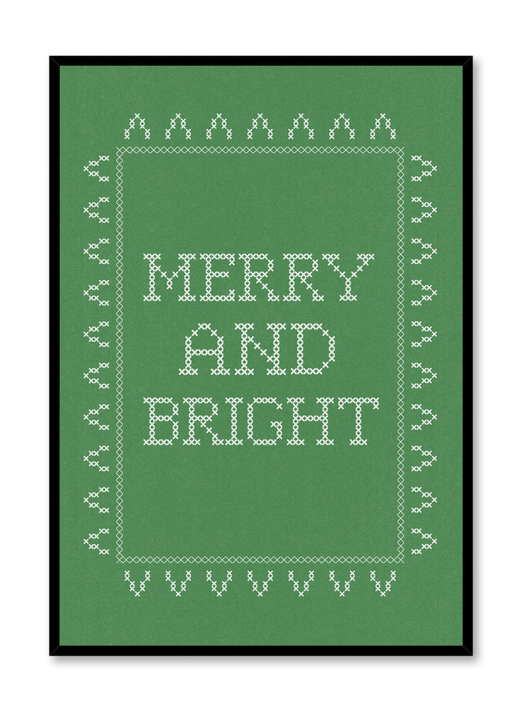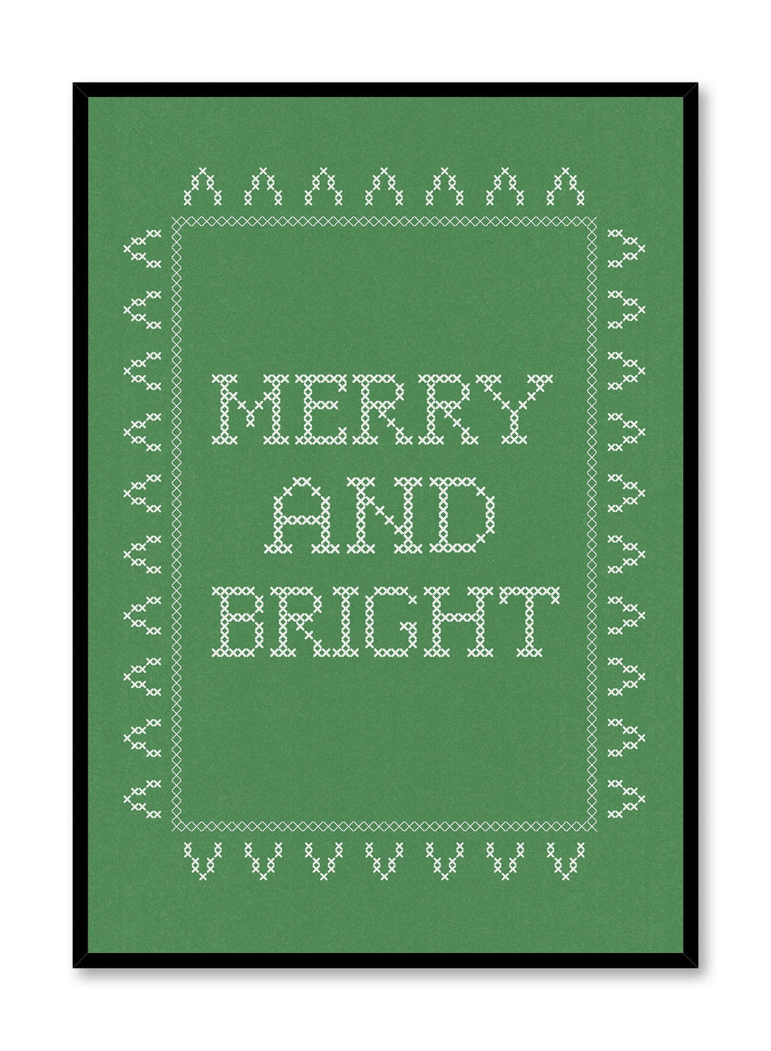 Cette affiche présente un charmant motif en point de croix avec les mots « Joyeux et lumineux » élégamment inscrits au centre. Le texte est entouré d'une délicate bordure de motifs géométriques, rappelant les broderies traditionnelles des fêtes. Le fond vert offre une toile de fond festive, renforçant l'aspect chaleureux et artisanal de la pièce.