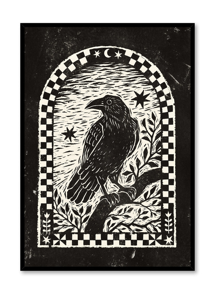 Ce saisissant affiche présente une représentation audacieuse en noir et blanc d'un corbeau perché sur une branche, entouré d'une arche à damiers. Le corbeau, avec ses plumes aux détails complexes, se détache sur un fond texturé, tandis que les étoiles et les croissants de lune ajoutent une touche de mystère. L'arche, ornée de motifs géométriques, encadre la scène, créant une impression de profondeur et de concentration.