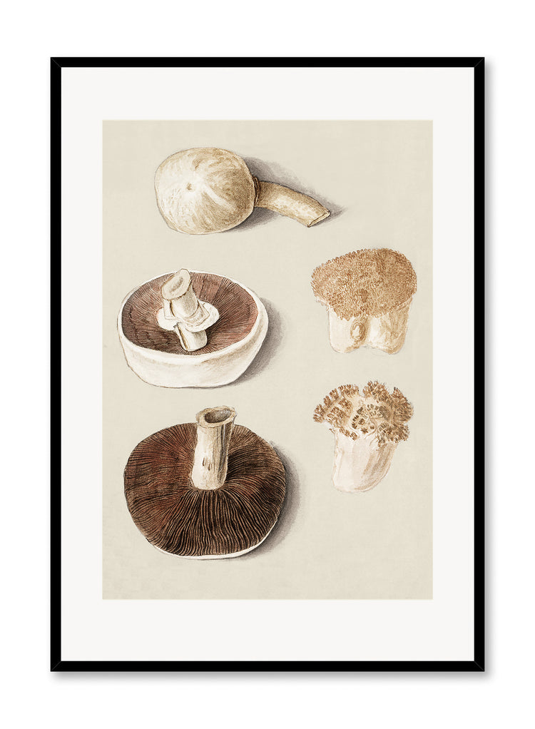 Cette délicate illustration botanique présente une gamme de champignons, chacun représenté avec des détails fins et un ombrage soigné. Les tons terreux de brun, beige et crème douce donnent vie aux champignons, tandis que les textures subtiles de leurs lamelles et chapeaux créent un sentiment de réalisme.