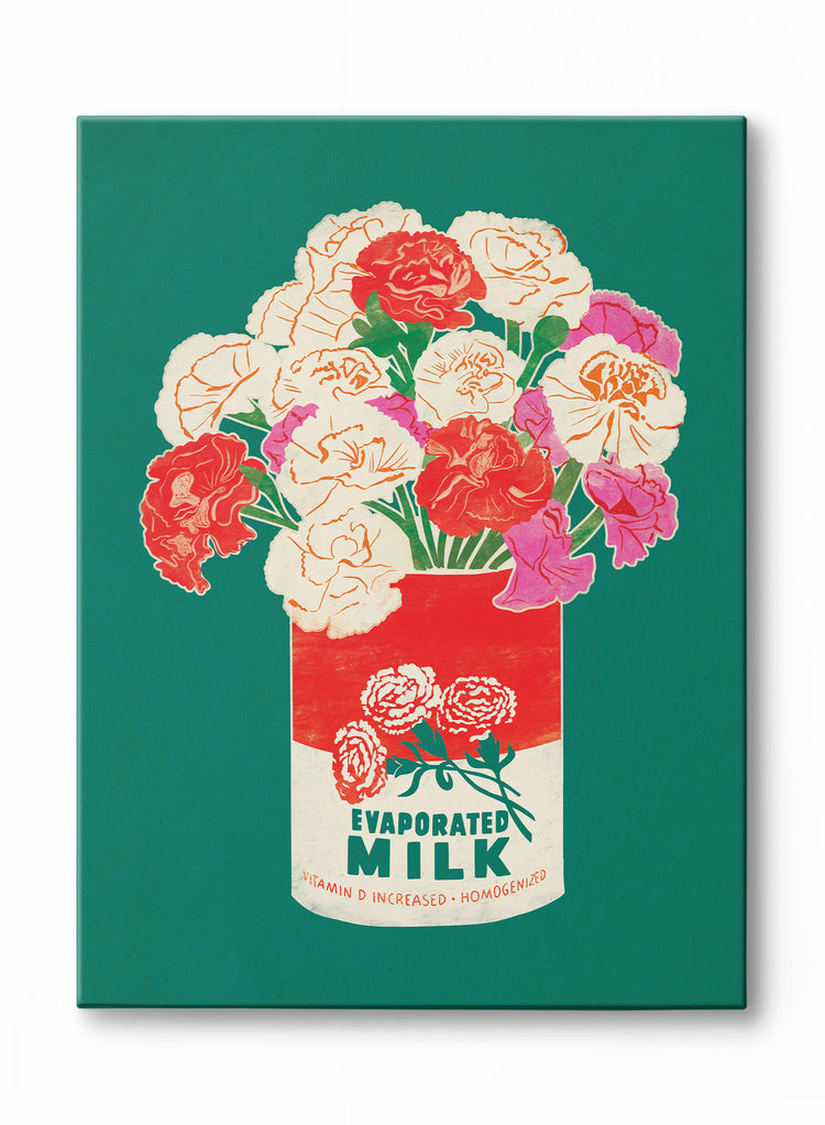 Cette œuvre sur toile vintage est composée d'une fleur luxuriante blanche et rose dans une boîte de lait évaporée sur un fond vert.