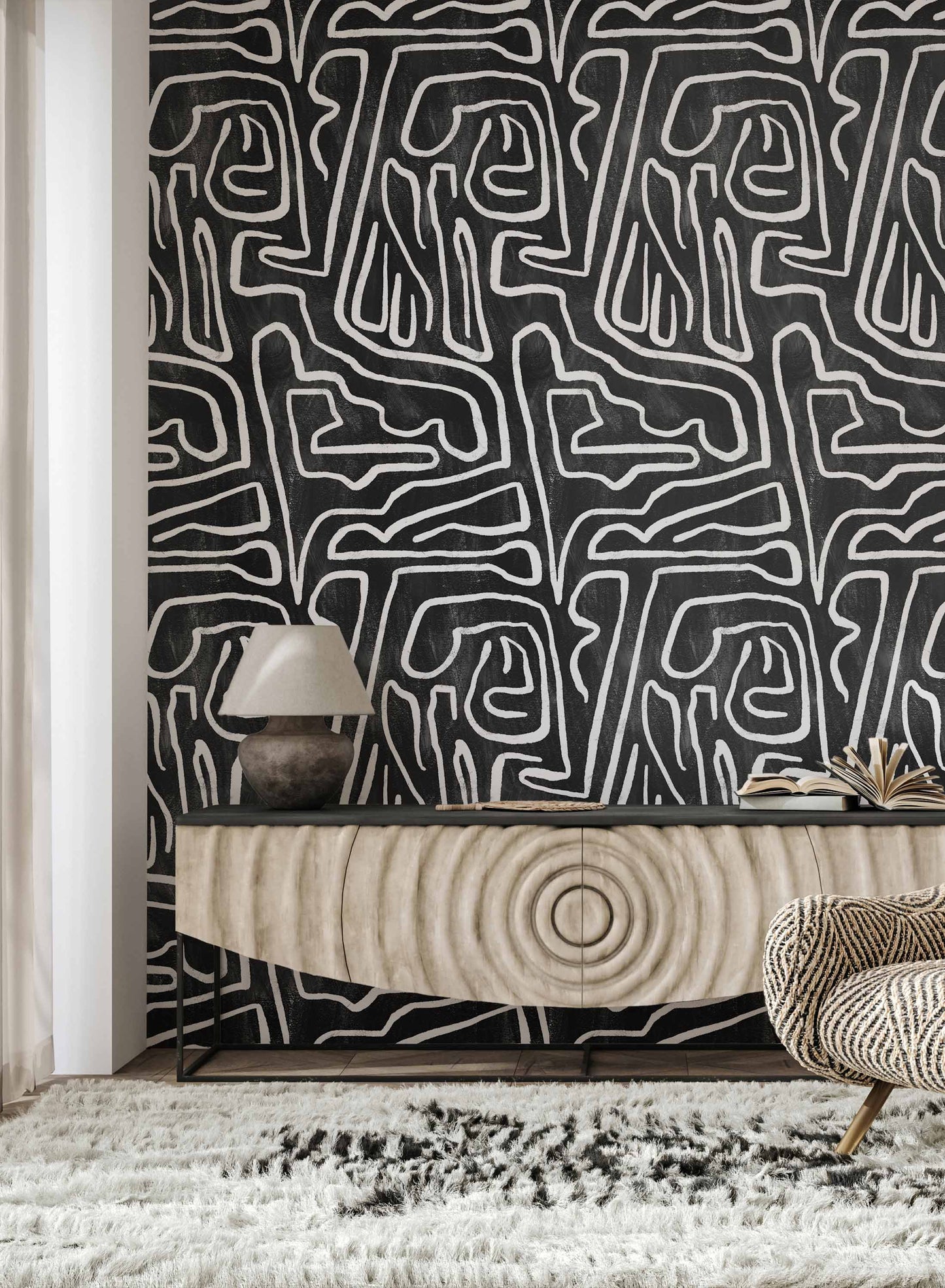 Celui-ci est époustouflant ! Le papier peint « Dakar » s'inspire de fabuleux motifs de tissus africains. Des formes abstraites vives sont tracées sur un fond richement texturé, créant un joli effet duochrome. Choisissez le fond beige avec des motifs noirs pour un look boho ou optez pour le fond noir et les rayures blanches pour une touche moderne. Trouvez ce papier peint en format vinyle autocollant ou en papier mat préencollé dès aujourd'hui.