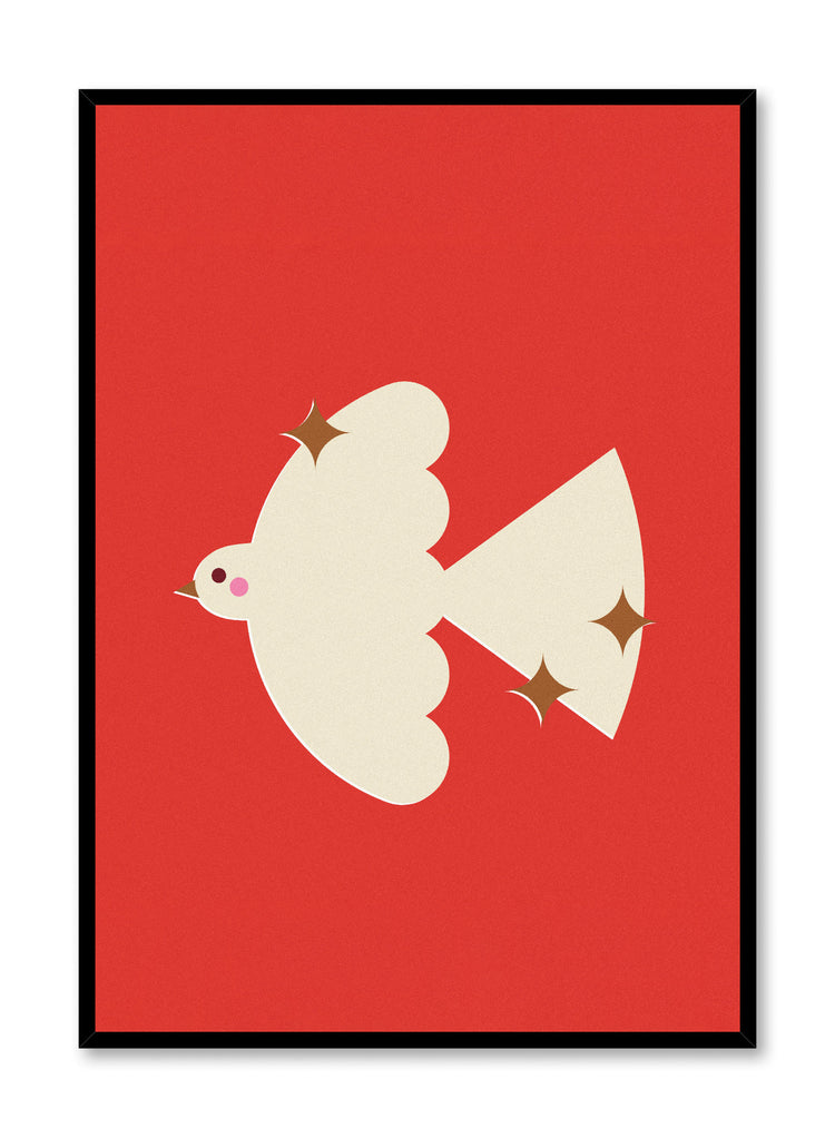 Cette œuvre d'art minimaliste représente une colombe de couleur crème sur un fond rouge vif. Les lignes simples et épurées du corps de la colombe sont rehaussées de petites étoiles dorées, qui ajoutent une touche festive. Le contraste audacieux entre la colombe et le fond crée un impact visuel frappant, tandis que la douceur de la forme de l'oiseau apporte un sentiment de paix et de calme.