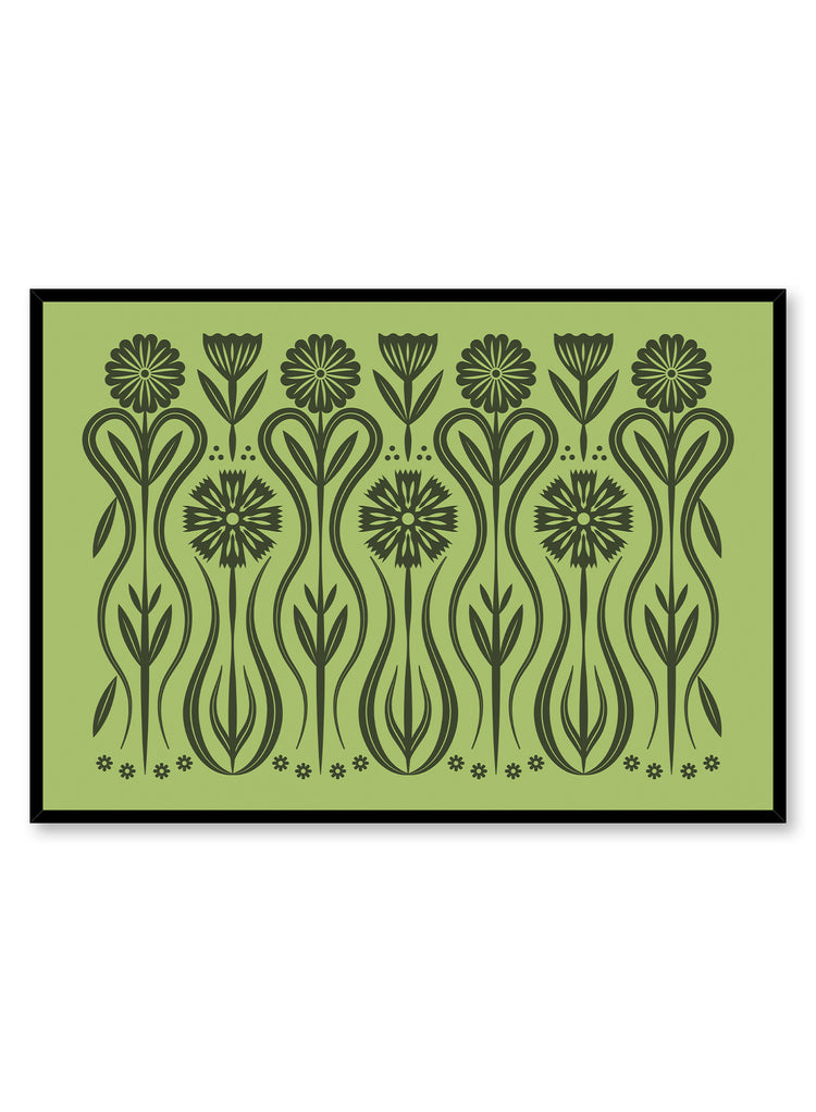 Une danse rythmique de symétrie botanique, cette affiche de Bailey Sullivan transforme la flore en folklore. Des tiges stylisées se tissent et se déploient en délicates fleurs, leurs formes évoquant la broderie vintage et les motifs d'art populaire. Les lignes vert forêt profond contrastent de manière saisissante avec un fond de mousse atténué, créant un motif à la fois intemporel et contemporain.