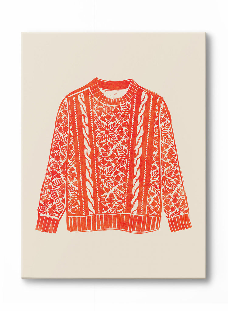 Cette œuvre sur toile présente un pull de vacances classique, d'un rouge éclatant, avec des motifs complexes de flocons de neige, d'étoiles et de textures en tricot câblé. Le design du pull est à la fois festif et intemporel, les riches tons rouges se détachant sur le fond neutre. Les motifs détaillés du pull ajoutent un sentiment de texture et de chaleur, évoquant la nostalgie des fêtes de fin d'année.