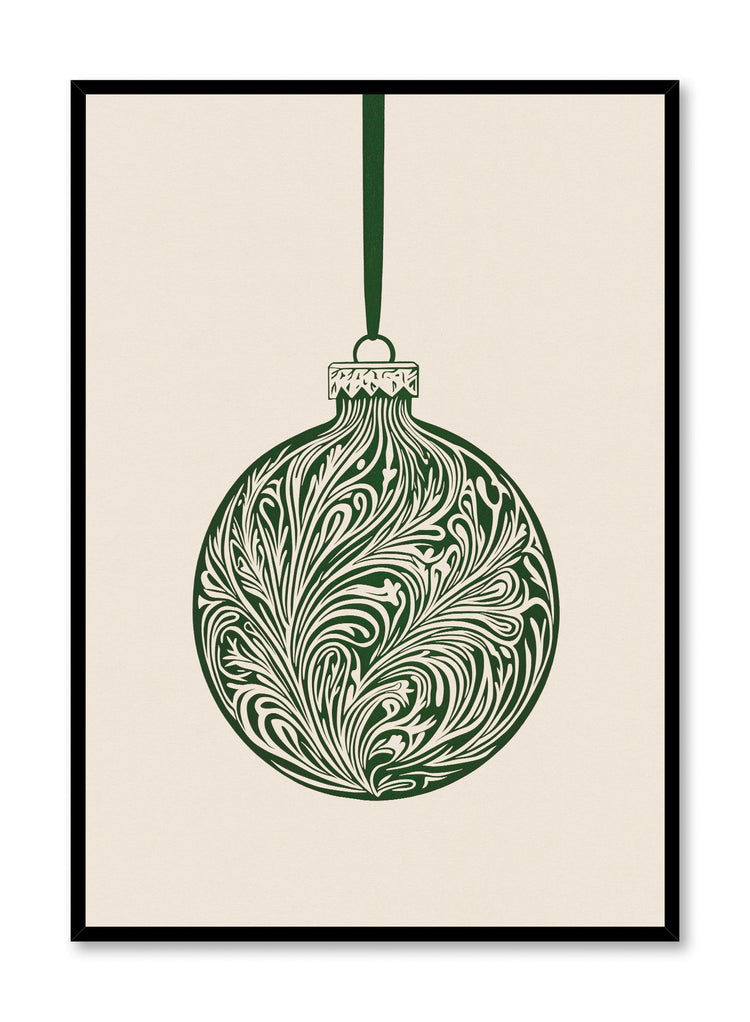 Une élégante décoration de Noël verte est suspendue gracieusement dans cette illustration, qui présente des motifs complexes et tourbillonnants évoquant l'artisanat traditionnel. La décoration est suspendue par un ruban, ce qui ajoute une touche subtile à l'esprit des fêtes. Les lignes détaillées de la décoration créent un contraste saisissant avec le fond crème, ce qui permet de faire ressortir le motif.