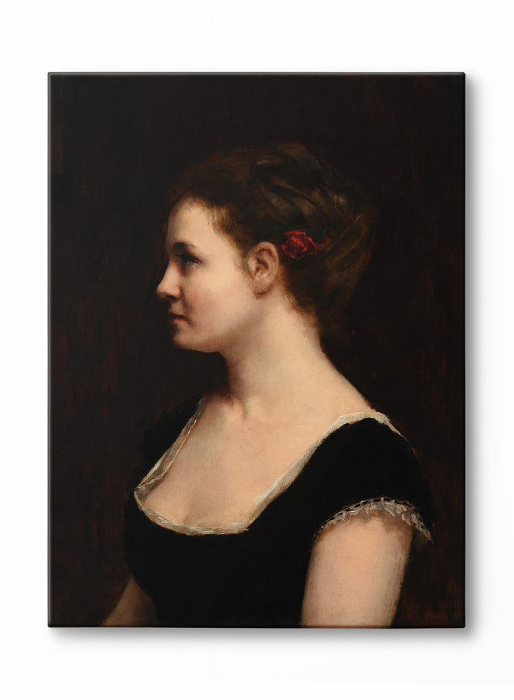 Sur cette œuvre sur toile intime, une jeune femme est représentée de profil, son visage calme et serein alors qu'elle regarde au loin. Elle est vêtue d'une simple robe noire avec un décolleté modeste, mais le point culminant de l'œuvre sur toile est la rose rouge vibrante glissée dans ses cheveux foncés et tressés.
