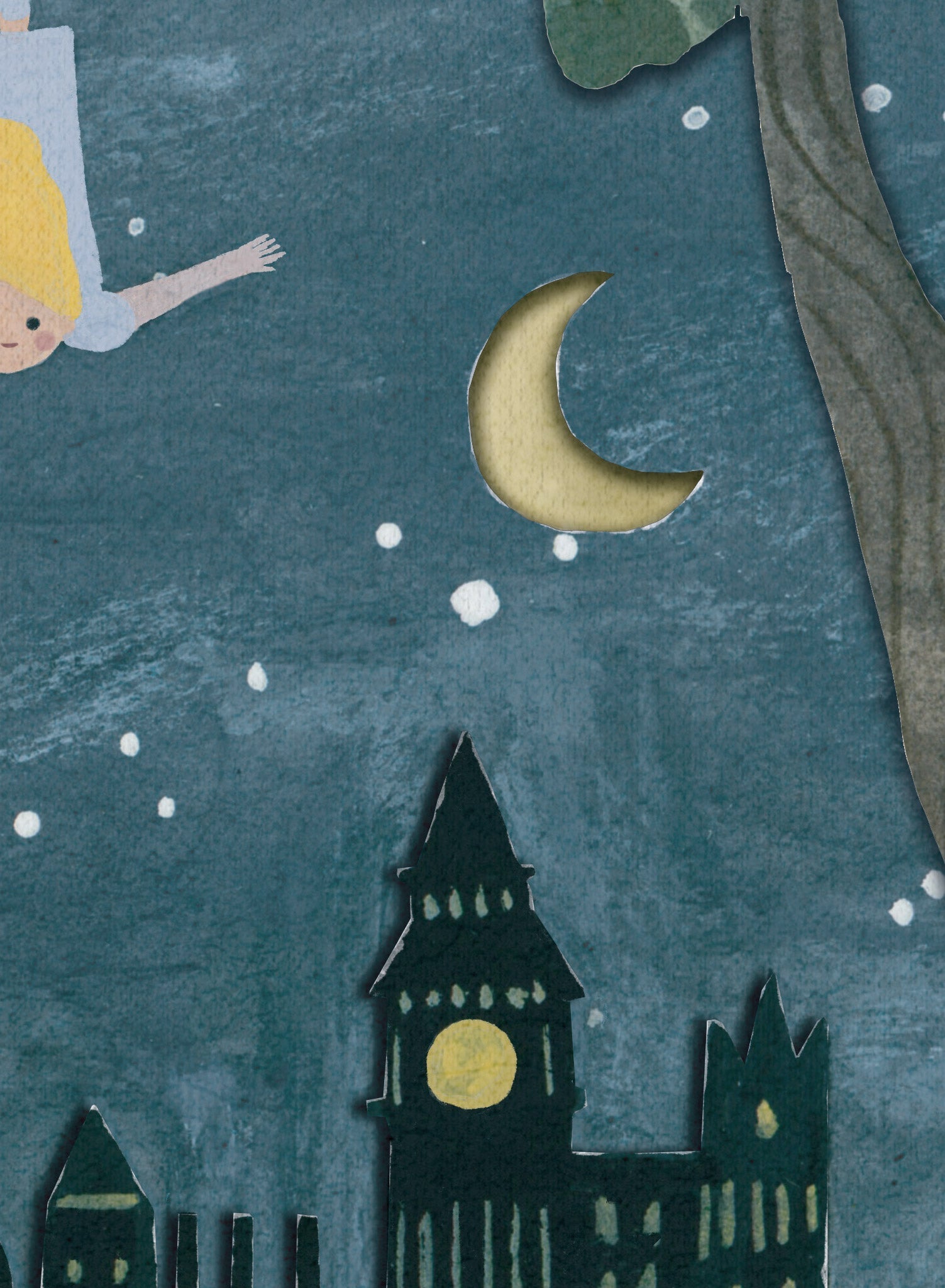 La riche palette de bleus et de verts profonds de la toile est ponctuée de blancs doux et de jaunes chauds, créant un équilibre harmonieux qui captive le regard. Les coups de pinceau texturés ajoutent de la profondeur et une qualité tactile, rappelant un diorama artisanal. Cet effet de superposition donne vie à la scène, donnant l'impression que les personnages pourraient s'envoler hors de la page, invitant à l'émerveillement et à la découverte.