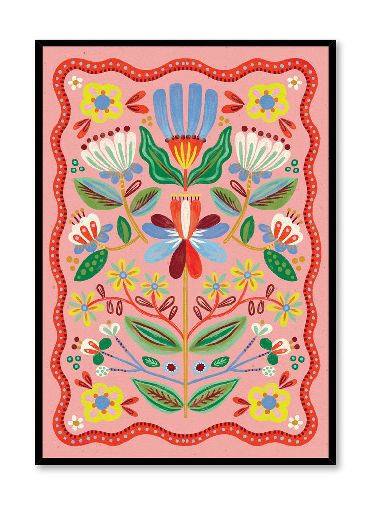 Fantaisie de l'art populaire concrétisée, cet arrangement floral de Kenzie Elston présente des fleurs en miroir encadrées dans une bordure de corail festonnée. Chaque fleur est soulignée par des traits picturaux, éclatant sur le fond rose saturé.