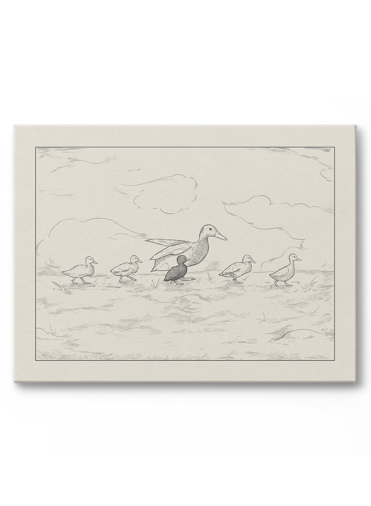 Cette œuvre sur toile légère dépeint une famille de canards en mouvement, voyageant ensemble à travers une étendue sereine. Les lignes fluides et décontractées confèrent à la scène un charme sans effort, tandis que la palette de tons doux la rend sobre et intemporelle.