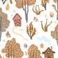 Rien ne vaut une aventure dans les bois ! "Cabanes cachées" célèbre chaque coin de la forêt avec un motif de cabanes rustiques, d'arbres et d'arbustes.