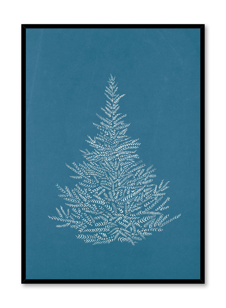 Cette image élégante représente le contour d'un pin blanc, délicatement dessiné sur un fond bleu riche. Les branches fines et plumeuses de l'arbre sont minutieusement détaillées, créant un sentiment de légèreté et de grâce. Le bleu profond de l'arrière-plan évoque une fraîche journée d'hiver, sur laquelle l'arbre blanc se détache nettement, comme s'il venait d'être saupoudré de neige.