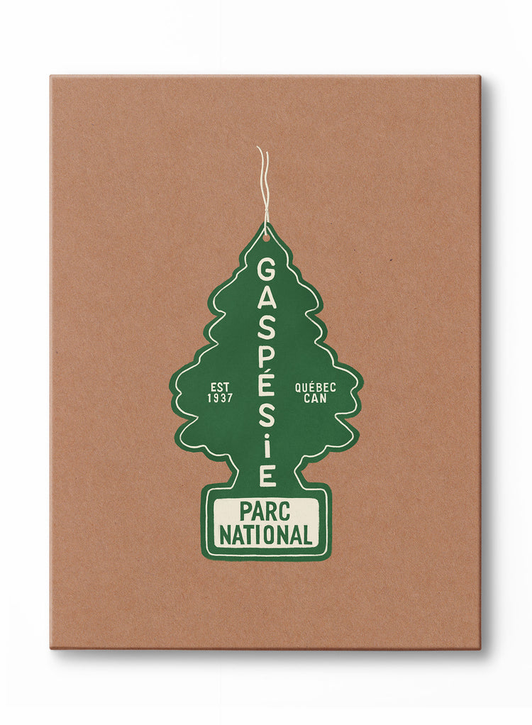 Cette œuvre sur toile présente un motif de tag en forme d'arbre qui ressemble aux célèbres désodorisants que l'on voit souvent accrochés dans les voitures, ce qui lui confère un aspect familier et ludique. L'image centrale est une silhouette de pin vert avec les mots ""Gaspésie Parc National"" bien en évidence en texte blanc. La référence à la Gaspésie, un parc national situé au Québec, au Canada, ajoute une touche de nature et de nostalgie, évoquant des souvenirs de voyages en voiture et d'aventures en plein air.