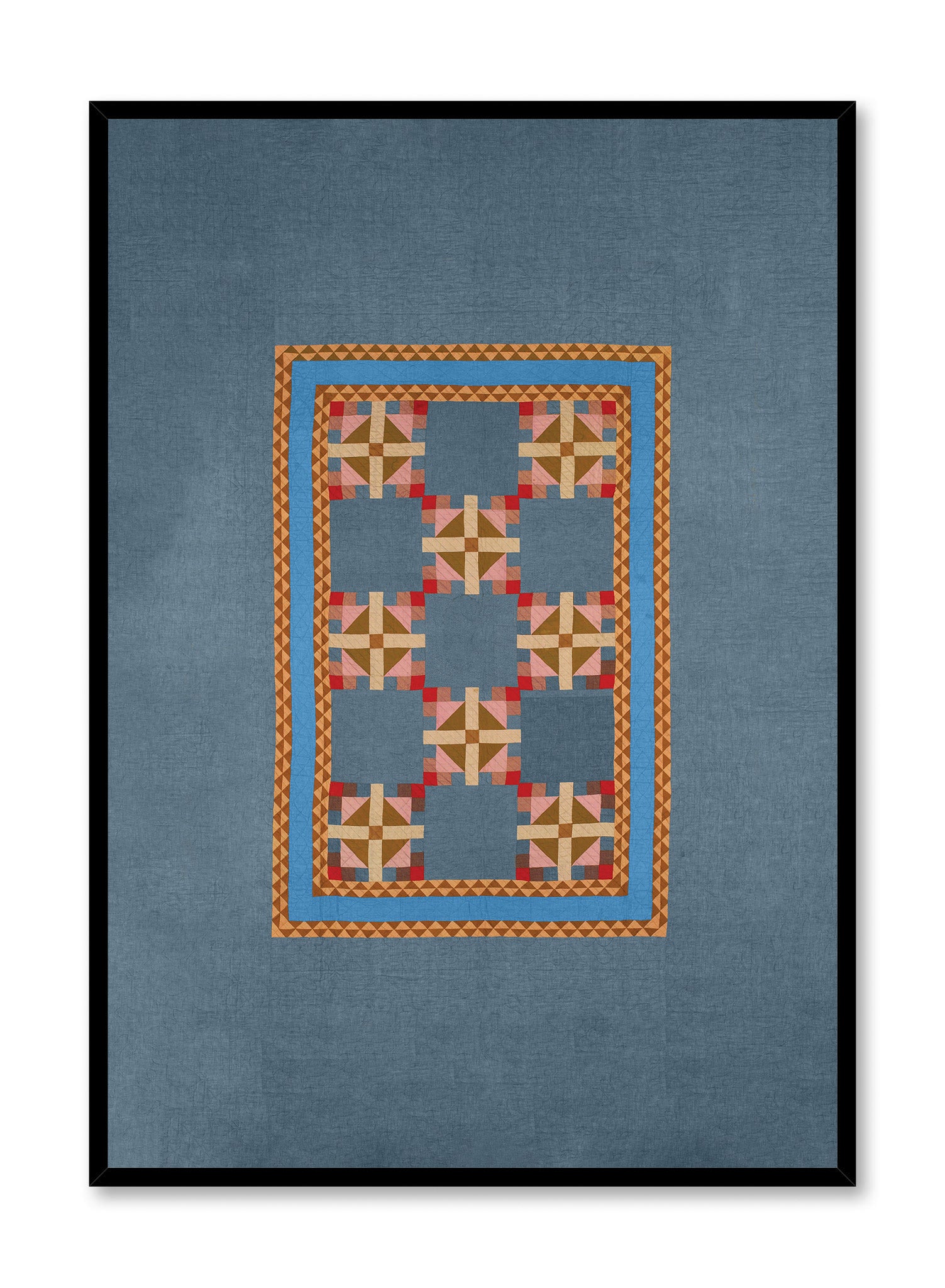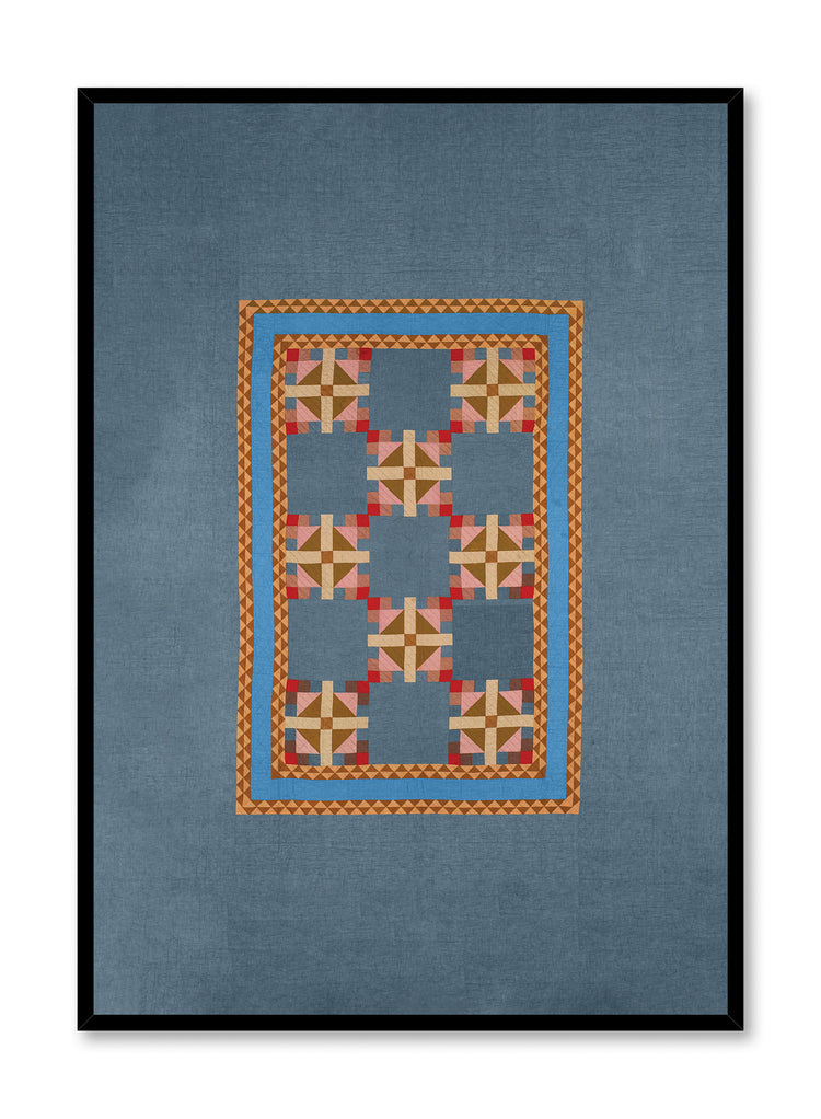 Ce affiche présente un motif géométrique saisissant rappelant les quilts traditionnels, sur un fond bleu profond et riche. Le motif central est composé de formes imbriquées dans des tons chauds de rouge, d'orange et de beige, créant une composition harmonieuse et équilibrée. La bordure complexe encadre le motif, ajoutant de la profondeur et une touche d'élégance à la pièce.