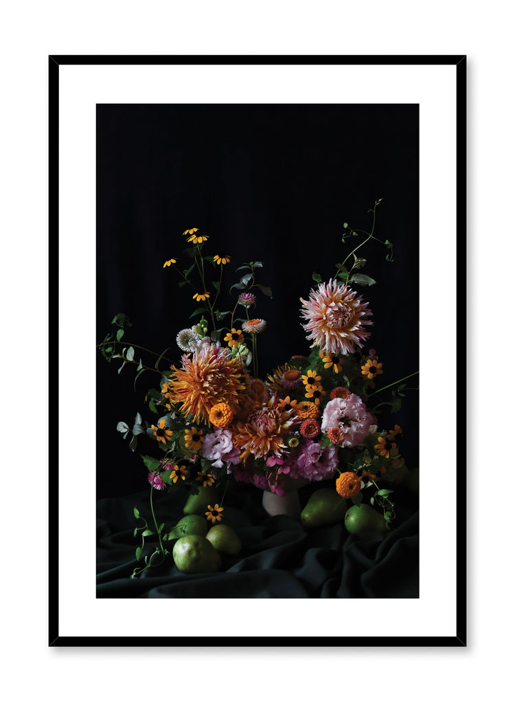 La parfaite touche de couleur pour les amateurs de décors sombres et moroses. Cette photographie florale est composé d'un fabuleux bouquet de fleurs multicolores dans un espace sombre.