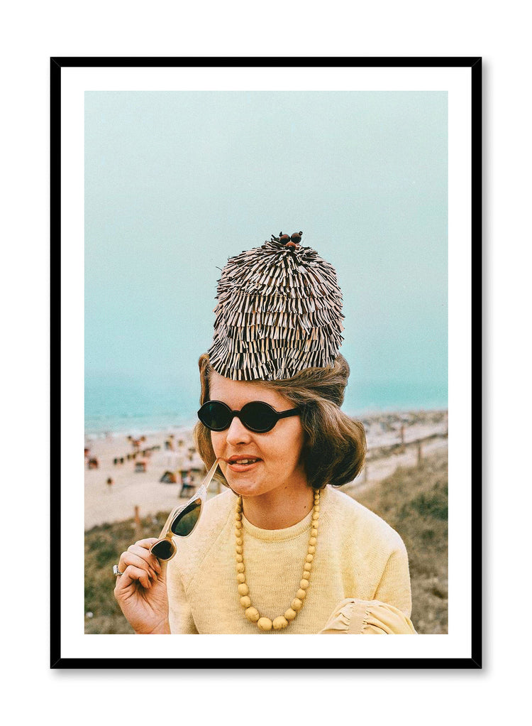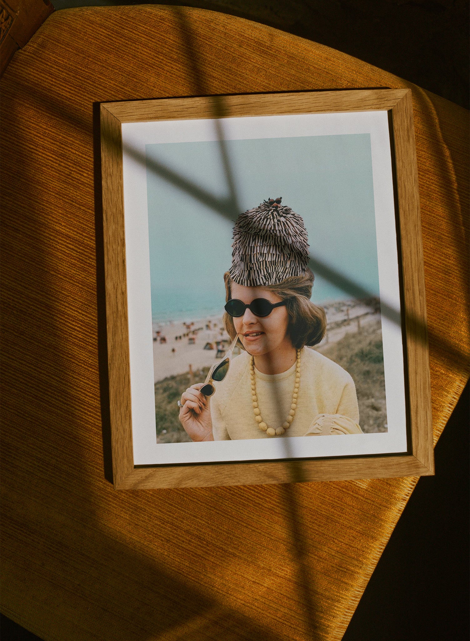Portrait captivant d'une élégance décalée, cette photographie d'archive de qualité galerie affiche célèbre un sens du style unique et inoubliable. L'expression réfléchie de la femme est encadrée par ses accessoires chics : un chapeau texturé façon ruche d'une originalité saisissante, un collier de perles jaune soleil et une paire de lunettes de soleil portées avec espièglerie sur ses lèvres. Découverte dans des archives photographiques rares, cette image évoque un précieux cliché de vacances européennes élégantes, capturant une personnalité aussi éclatante et mémorable que le soleil côtier.