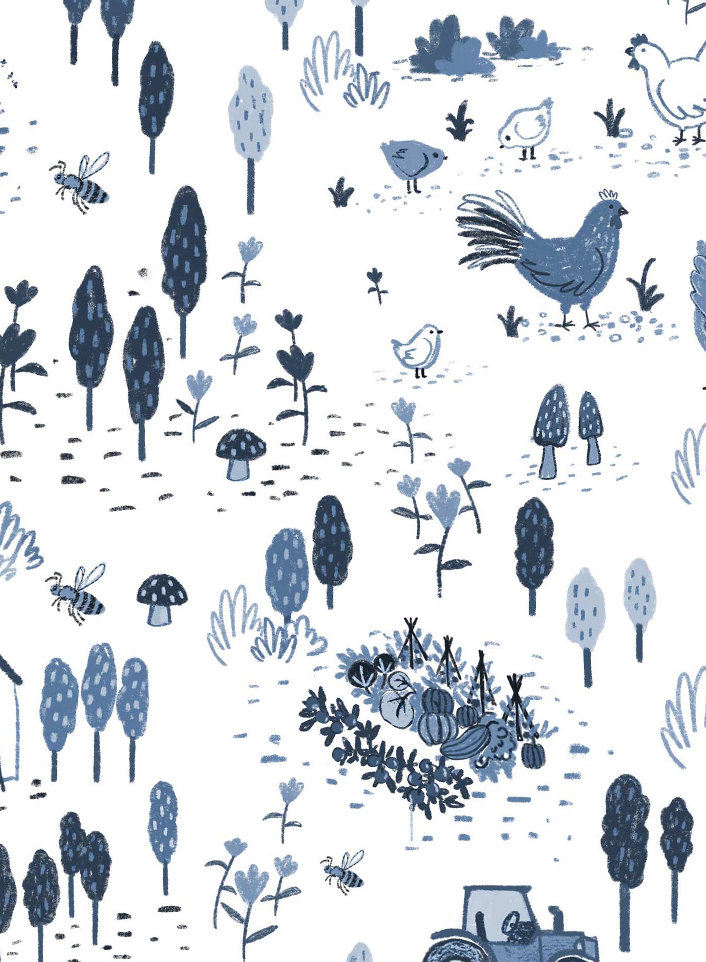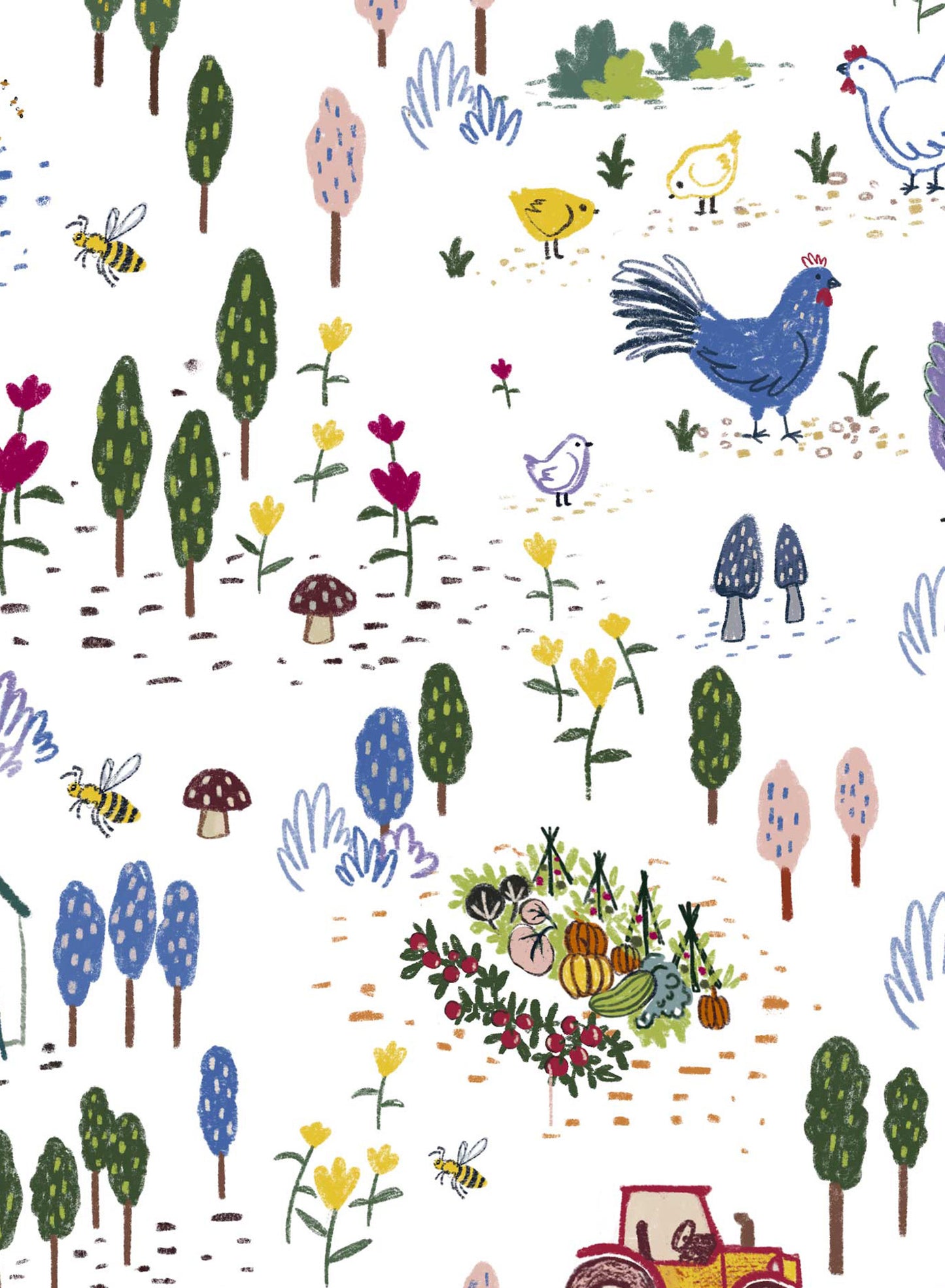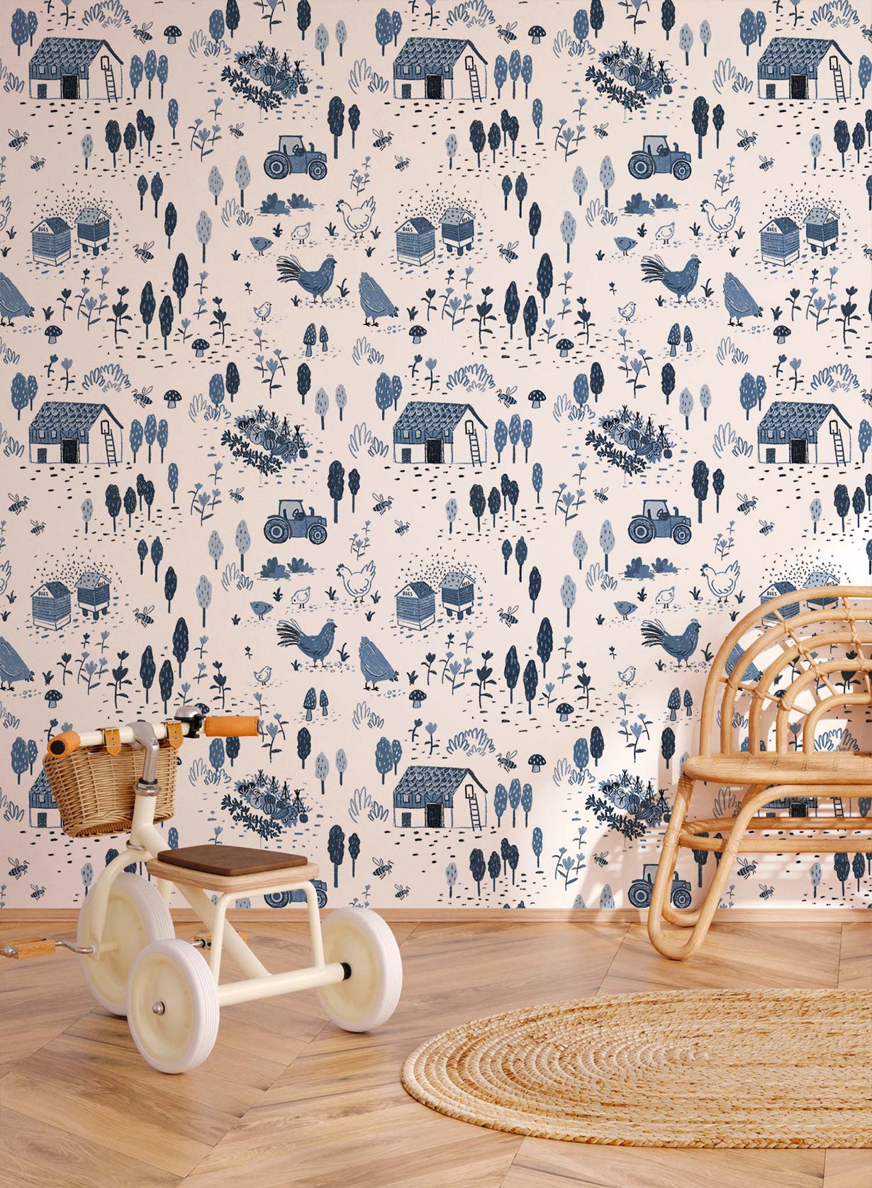 Vos petits fermiers vont adorer cet adorable papier peint avec des tracteurs, des poulets, des fleurs, des arbres et des bâtiments colorés ! Cet adorable paysage de ferme fascinera vos petits fermiers.