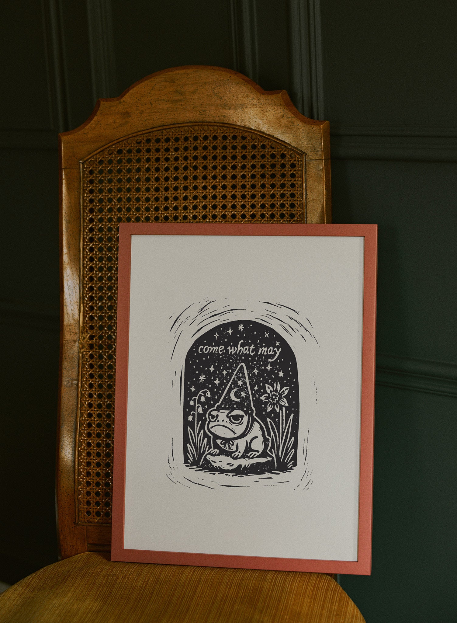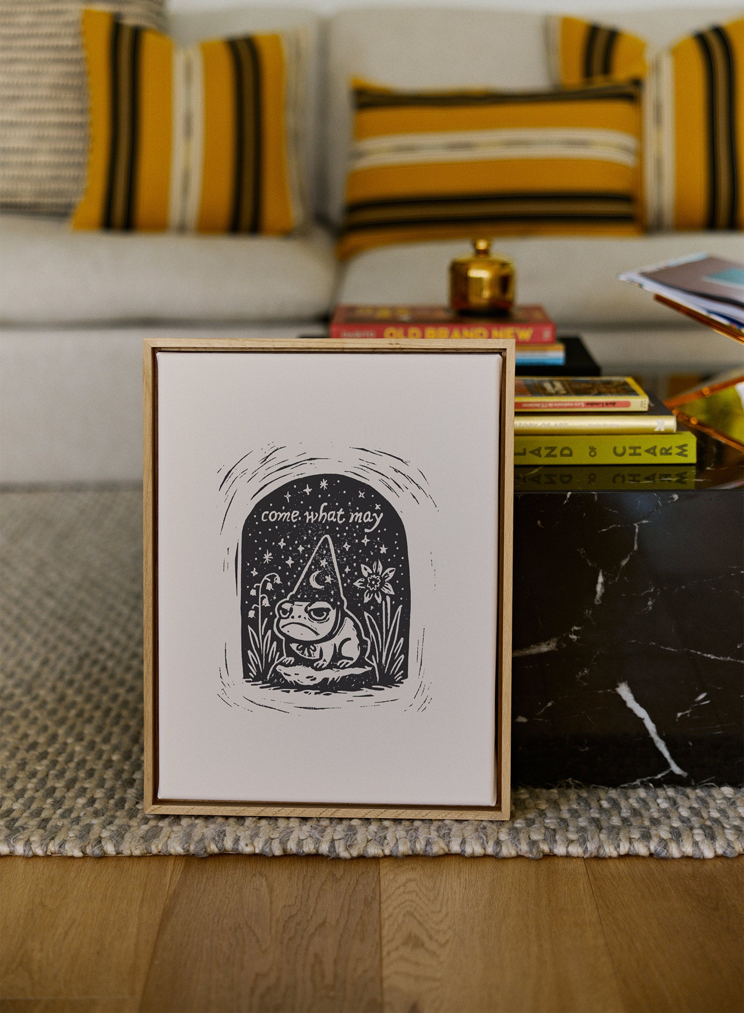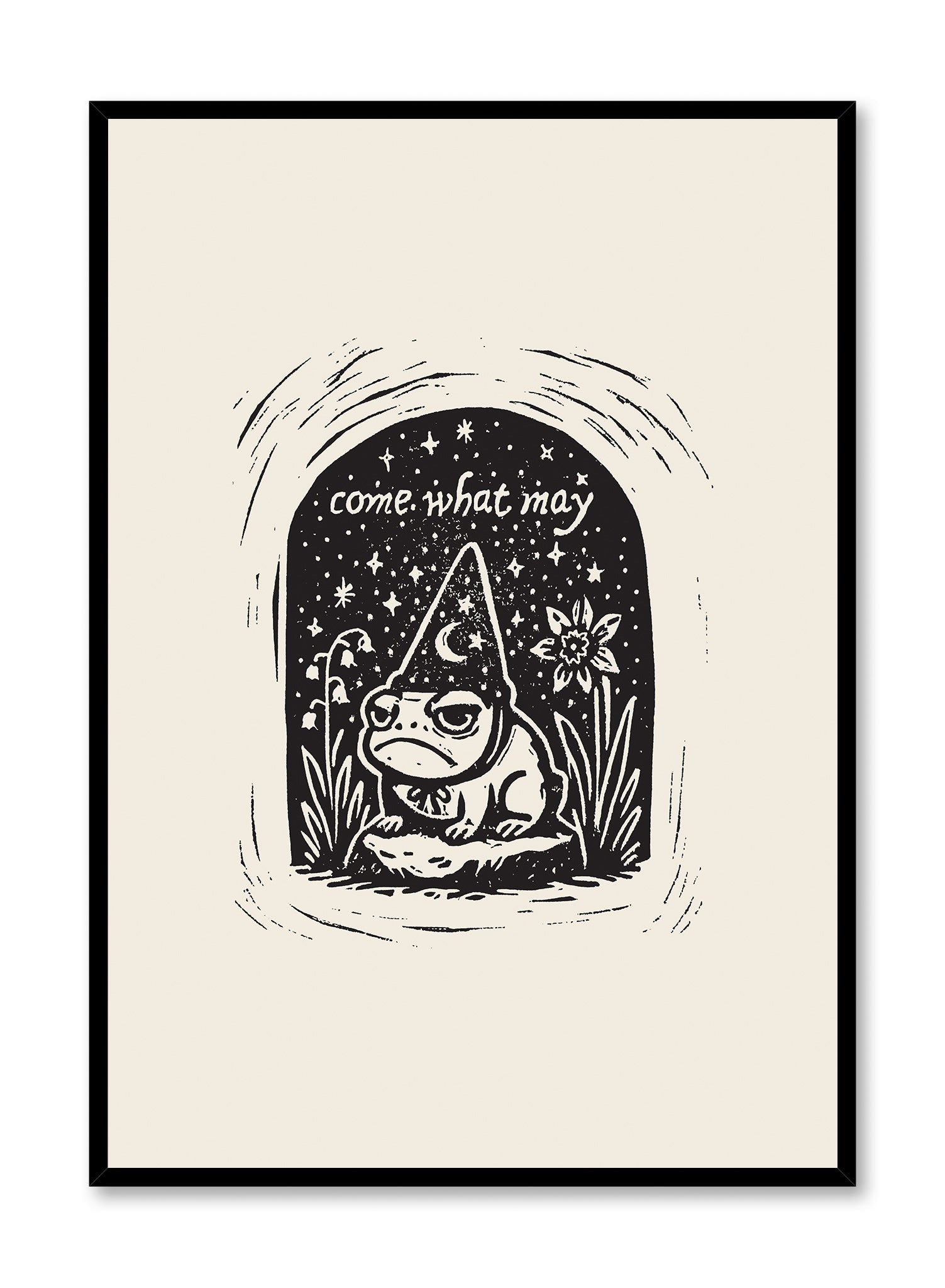 Ce affiche présente une charmante illustration d'une grenouille contemplative coiffée d'un chapeau pointu, nichée sous une arche fantaisiste. La phrase « advienne que pourra » flotte au-dessus, entourée d'étoiles scintillantes et d'une fleur délicate, créant une scène à la fois magique et introspective. La palette monochrome souligne la simplicité et la concentration du design, attirant l'attention sur le travail des lignes complexe et les détails ludiques.