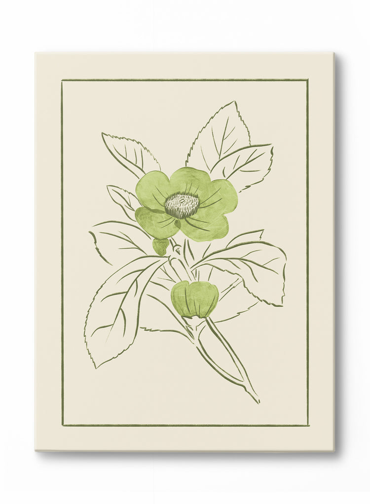 Cette œuvre sur toile florale est composée d'une fleur de pavot verte avec des tiges et des feuilles esquissées en vert sur un fond blanc.