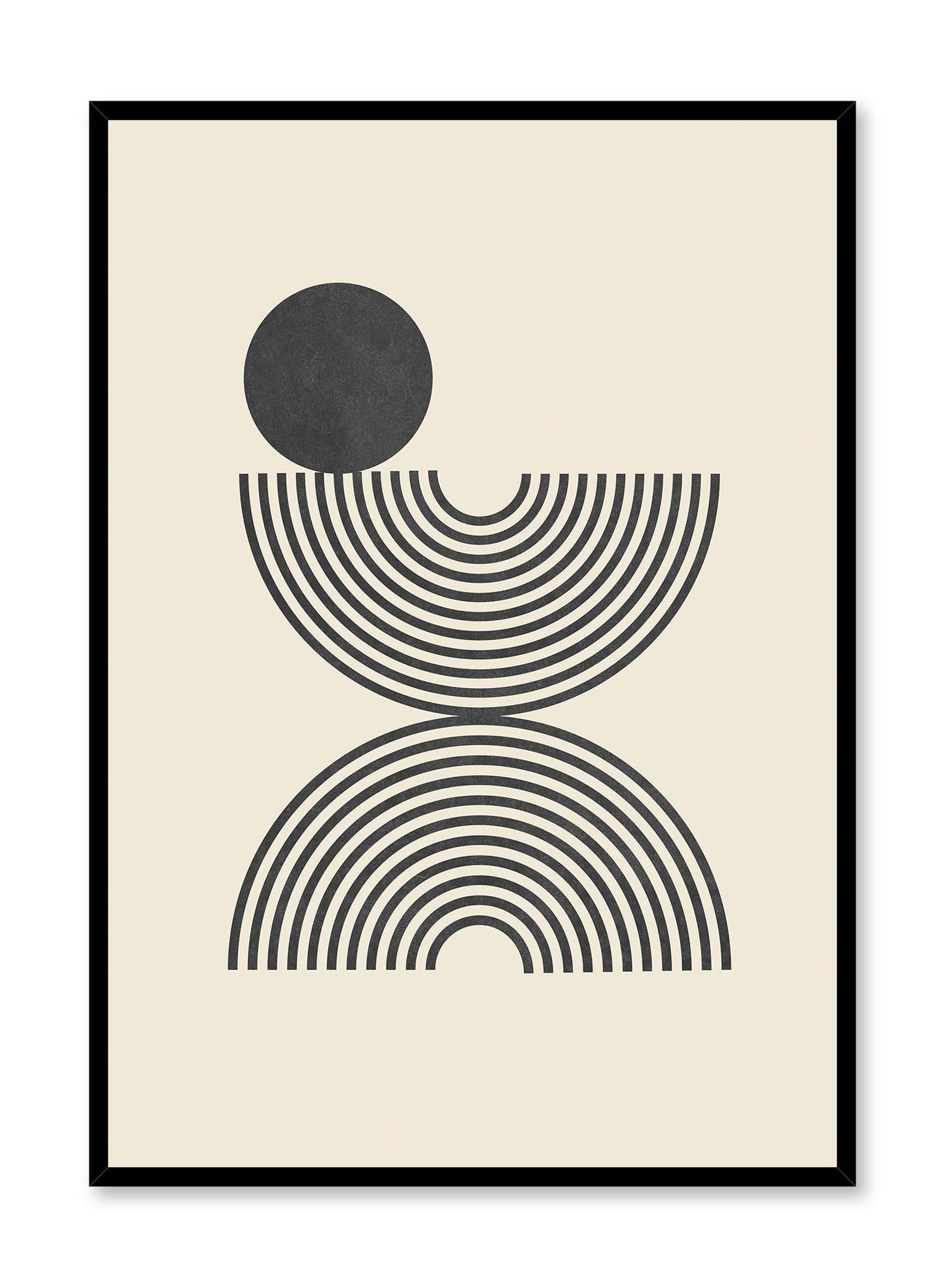 Lucia est l'affiche d'art Bauhaus parfaite avec un soupçon de style bohème. Nous avons opté pour la simplicité : deux arcs en miroir semblables à des arcs-en-ciel, surmontés d'un cercle noir audacieux, sur un fond beige apaisant. Cette affiche est superbe en soi ou dans une galerie murale de style mid-century.