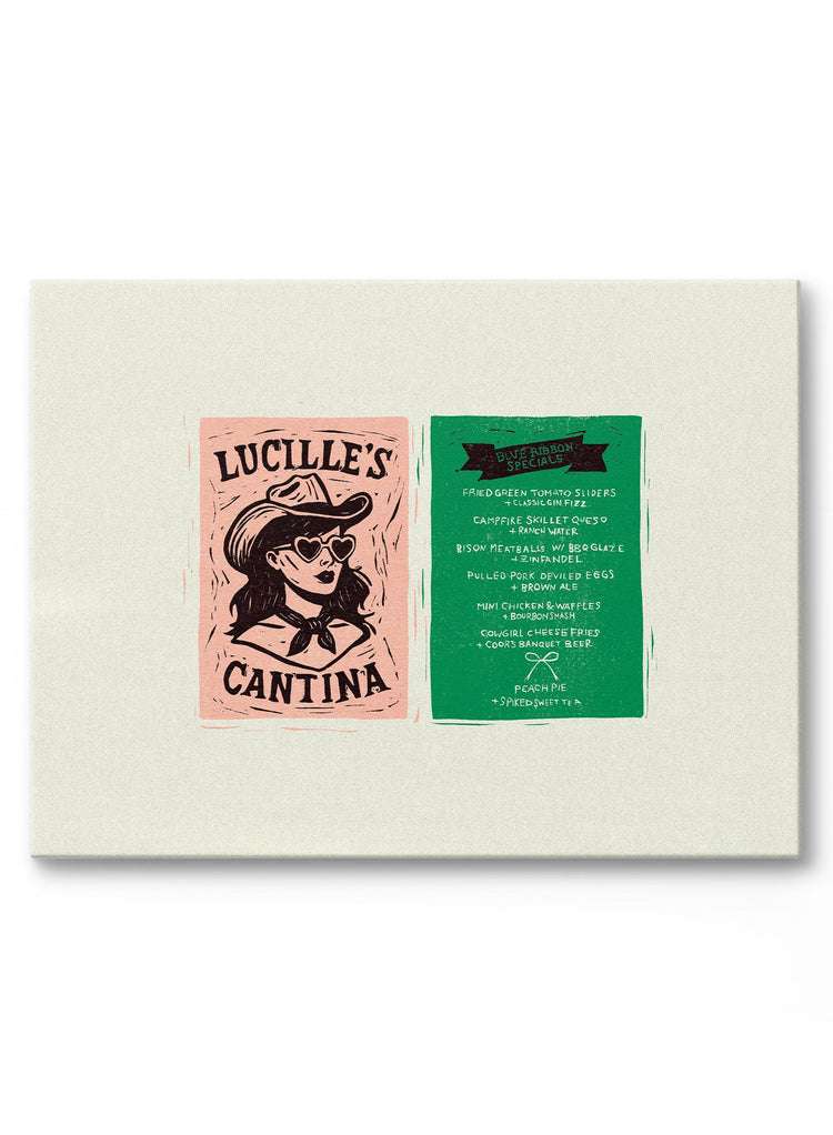 Cette toile est un hommage ludique aux souvenirs de restaurant, conçue comme un diptyque composé d'une boîte d'allumettes et d'un menu de la fictive « Lucille's Cantina ». Une charmante illustration d'une cow-girl orne la boîte d'allumettes rose, tandis que le menu vert présente des spécialités d'inspiration sudiste écrites à la main. C'est une œuvre d'art astucieuse qui raconte une histoire.