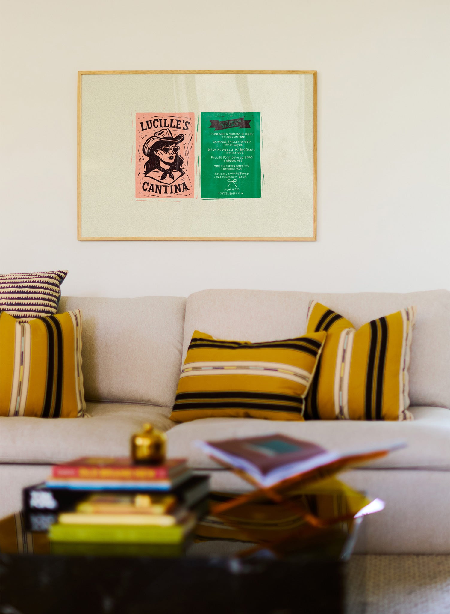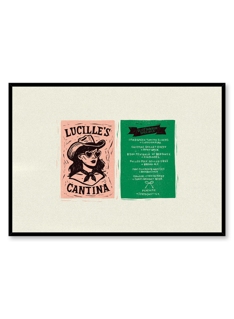 Cette œuvre d'art affiche est un hommage ludique aux souvenirs de restaurant, conçue comme un diptyque composé d'une boîte d'allumettes et d'un menu de la fictive « Lucille's Cantina ». Une charmante illustration d'une cow-girl orne la boîte d'allumettes rose, tandis que le menu vert présente des spécialités d'inspiration sudiste écrites à la main. C'est une œuvre d'art astucieuse qui raconte une histoire.