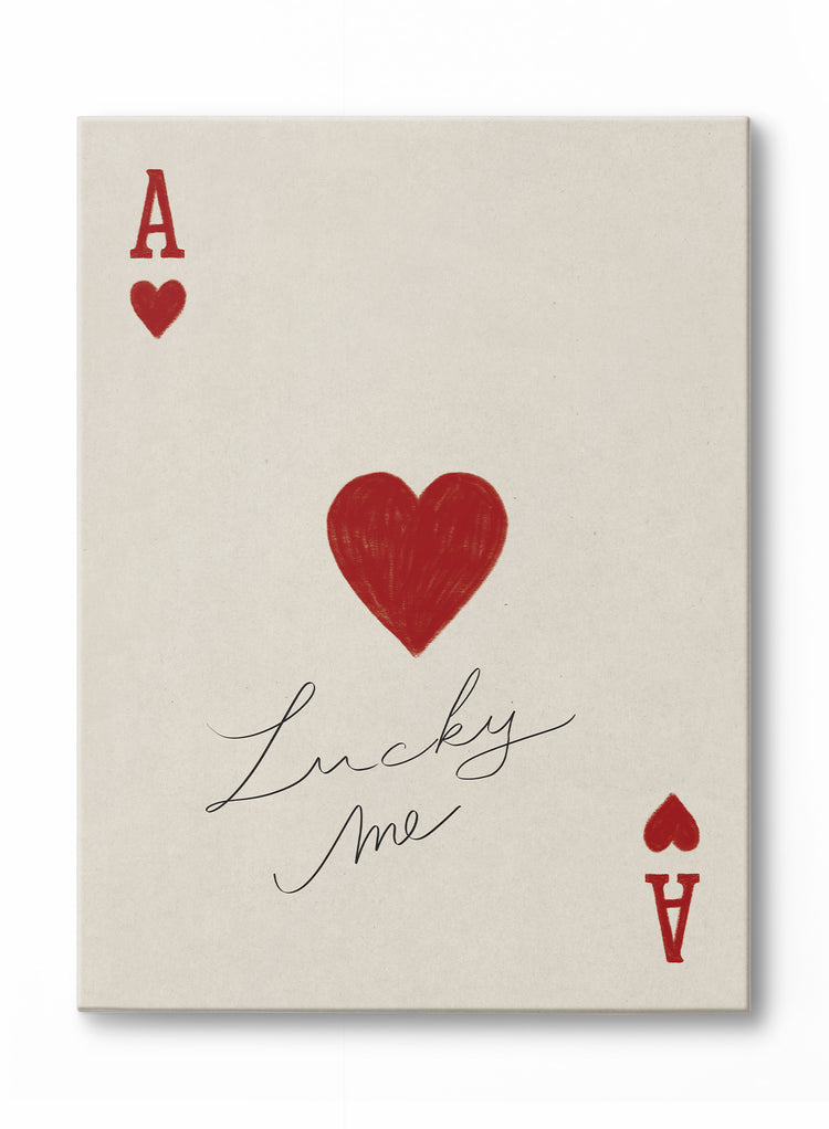 Cette œuvre sur toile charmante capture un clin d'œil ludique à la romance avec un design de carte d'as de cœur rouge, ponctué par la phrase manuscrite « Lucky Me ». Le cœur central, esquissé avec une texture organique, ajoute chaleur et caractère à cette composition minimaliste.