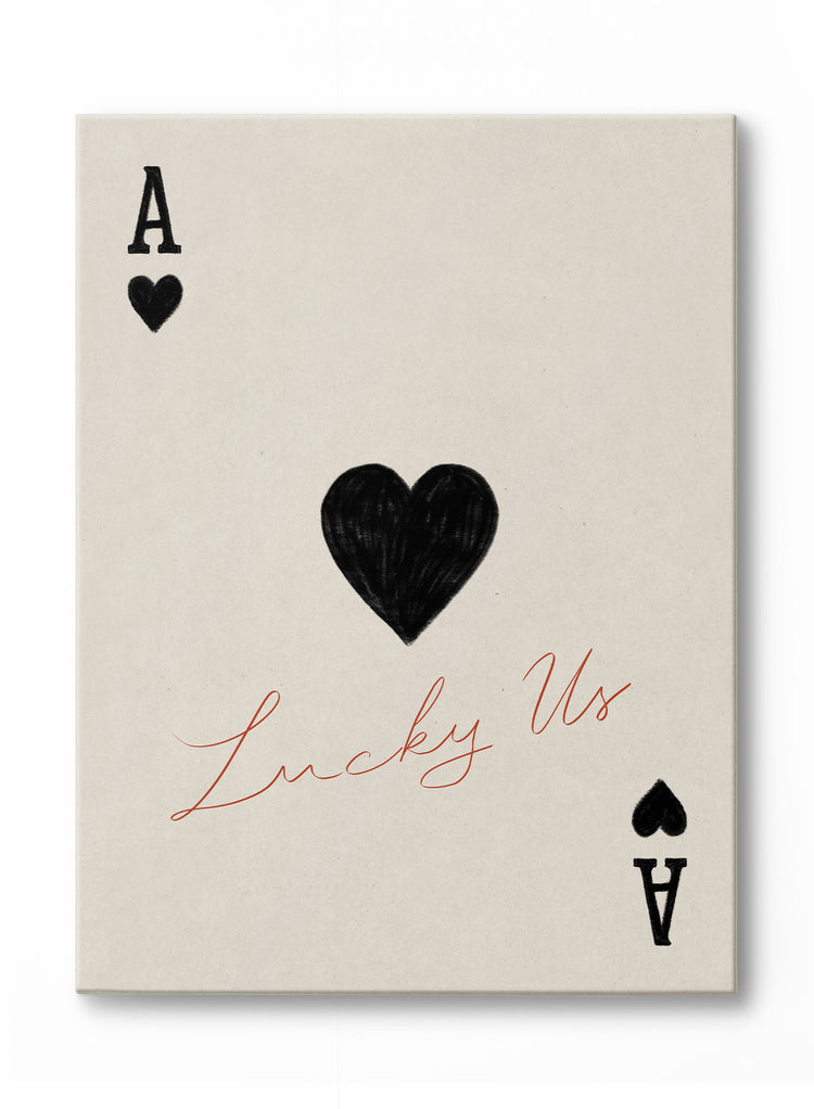 Cette œuvre sur toile sophistiquée réinvente l'as de cœur avec une touche moderne, mettant en vedette un cœur noir texturé au centre et la phrase manuscrite « Lucky Us » en élégante écriture rouge. Le contraste saisissant entre les éléments noirs et rouges sur le fond beige doux crée un design audacieux mais raffiné.