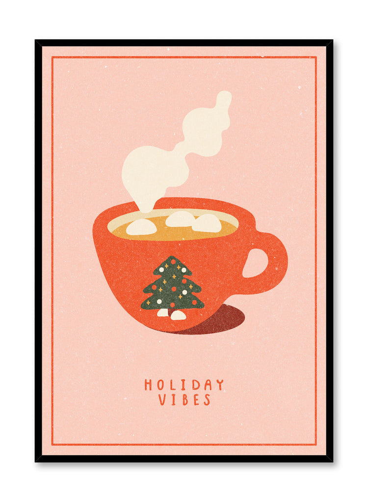 Cette affiche minimaliste de vacances présente une tasse rouge chaude remplie de cacao chaud fumant et surmontée de guimauves moelleuses. Le fond rose pastel et le design audacieux du mug donnent à l'œuvre d'art une touche moderne mais nostalgique. Un petit sapin de Noël sur le mug et la phrase « Holiday Vibes » en dessous ajoutent une touche de gaieté.