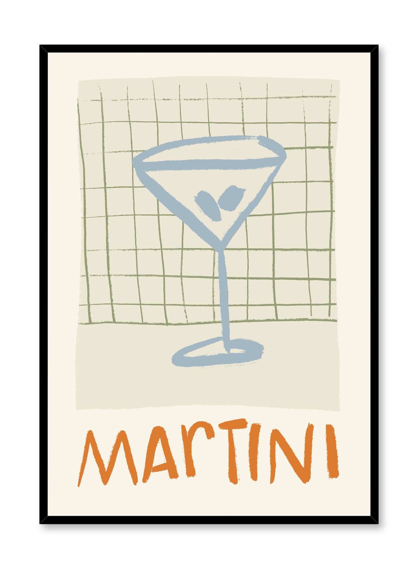 Nous prendrons un Martini à siroter et un autre à suspendre ! "Martiniville" est une illustration d'un verre à Martini bleu devant un fond vert à carreaux, avec le mot "Martini" écrit en caractères rouges gras.