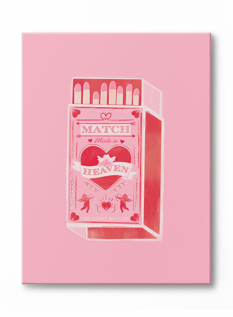 Cette œuvre sur toile vibrante ajoute une touche de plaisir et de romance avec son design de boîte d'allumettes inspiré du vintage, arborant la phrase ludique « Match Made in Heaven ». Les teintes roses vives et les détails complexes, y compris des figures chérubines et un motif de cœur audacieux, évoquent la nostalgie tout en célébrant la connexion.