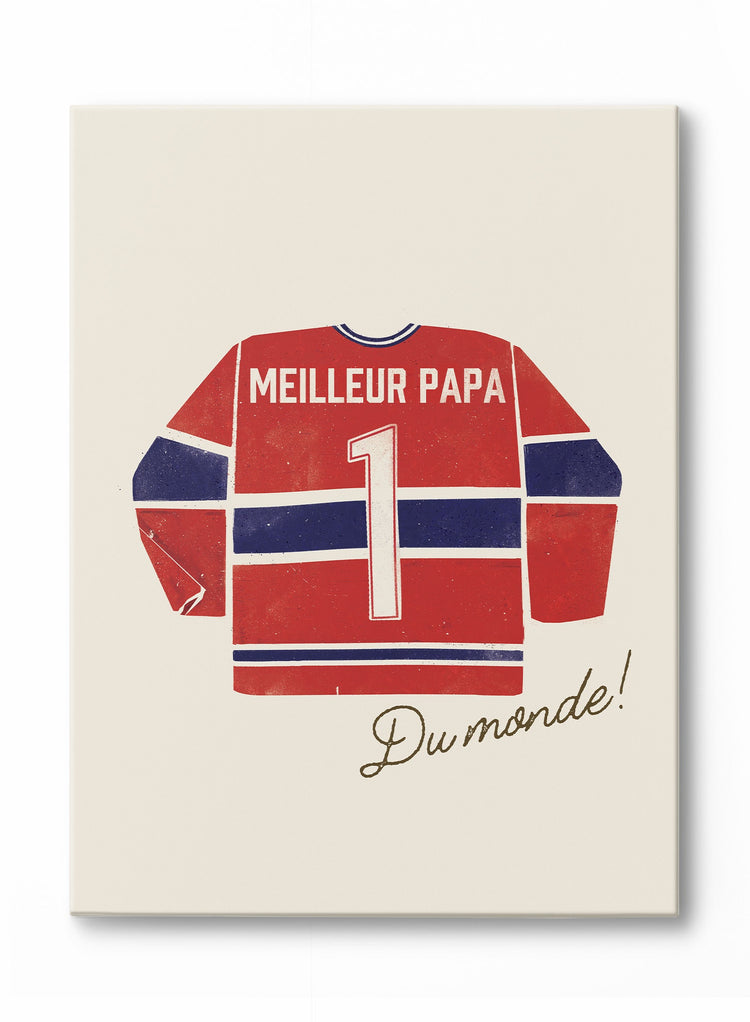 Célébrant la paternité avec un enthousiasme sportif, cette toile d'inspiration vintage présente un maillot de hockey rouge classique, personnalisé avec le message réconfortant « Meilleur Papa Du Monde ! » Des lignes audacieuses et épurées, ainsi qu'une esthétique authentique, mettent en valeur la fierté de l'équipe avec une touche de sentimentalisme.