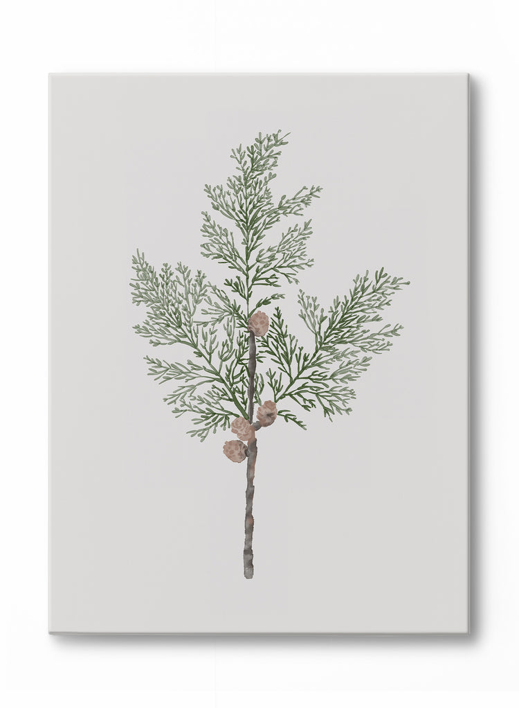 Ouvrez les festivités avec "Branche Festive" : une œuvre sur toile botanique représentant une délicate branche de conifère avec des glands sur un fond gris.