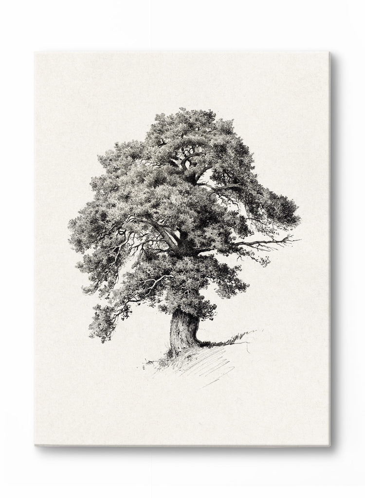 Cette esquisse détaillée d'un chêne imposant incarne la force tranquille et la présence durable de la nature. Chaque ligne complexe met en valeur les branches étendues de l'arbre et son tronc épais et robuste, tandis que les ombrages doux insufflent de la vie au feuillage, lui donnant une qualité texturée, presque tangible.
