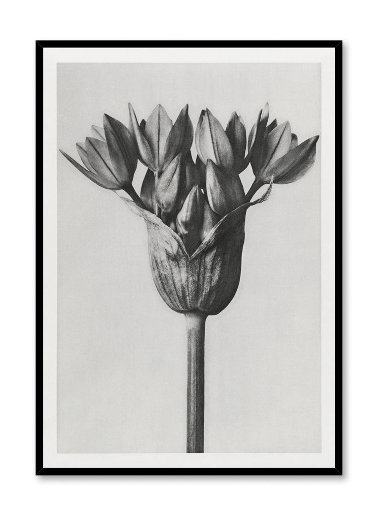 Cette affiche artistique saisissante présente une vue rapprochée d'une fleur dans une palette monochromatique, mettant en valeur son élégance naturelle et sa forme complexe. Les pétales et la tige détaillés prennent une qualité sculpturale, invitant le spectateur à apprécier la beauté brute de la fleur. Le jeu subtil de lumière et d'ombre souligne chaque pli et courbe, créant un sens de profondeur et de texture qui semble presque tactile.